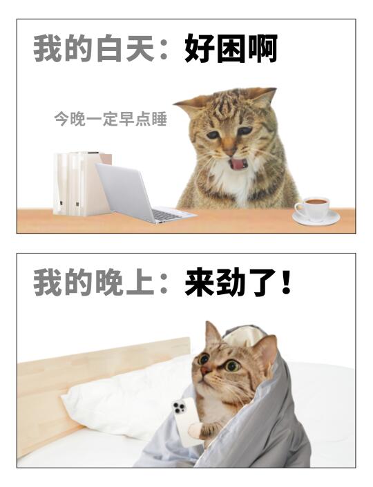 当我看到工作消息:爱谁谁吧 当我看到群聊吵架:爬楼八百层吃瓜 我的白天:好困啊!今晚一定早点睡 我的晚上:嗯!来劲了! 当我玩的时候:时间挤挤总会有的~ 当我要做正事的时候:时间去哪儿了! 搞笑打工人上班八卦吃瓜大学生不想上班睡觉熬夜犯困ddl当代年轻人猫表情包内容过于真实搞笑的日常摸鱼精神状态