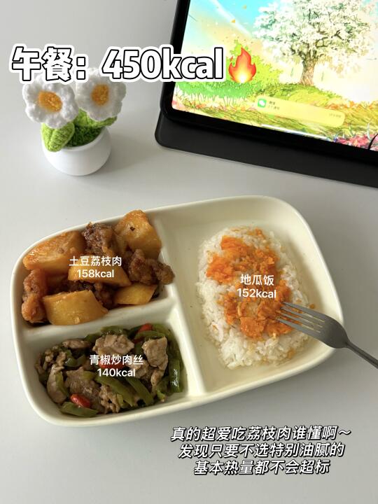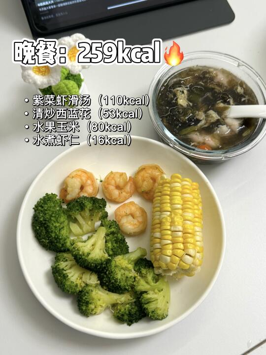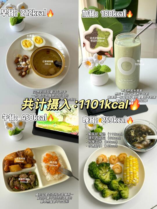 早餐:水煮蛋. 坚果. 红枣银耳羹 午餐:土豆荔枝肉. 青椒肉丝. 米饭 加餐:低卡抹茶奶茶 晚餐:虾仁.玉米.炒西兰花 加餐:虾滑紫菜蛋花汤 - [向右R]总结共计摄入~1101大卡🔥 这样一看其实每天吃1200大卡,能吃的还是挺多的!! 还有100大卡热量缺口,可以用来吃点小零食解馋[偷笑R]~ ——注:热量均为称重计算。 - ✅记录饮食目的: 每天纠结不知道吃什么的姐妹可以做个参考~