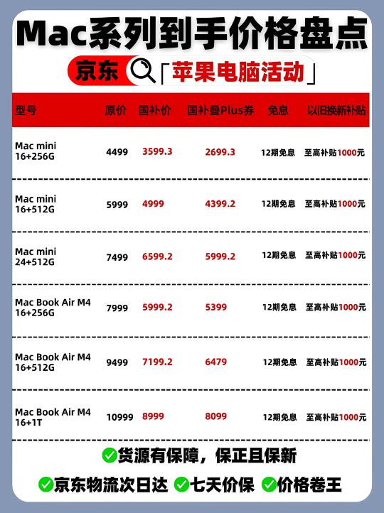 🔥618 年中购物节火热开启!京东针对 MacBook Air M4 推出重磅补贴16+256GB 版本叠加多重优惠后仅 5399 元起,直降近 3000 元! 无论是学生党刚需换机,还是办公族追求轻薄长续航 这次都是不容错过的换机时机,各位宝子们速看详细优惠攻略 —— ⭐活动参与指南 ▶直达会场:京东🔍「苹果电脑活动」进入主会场,这里集合了全系列 Mac 产品的实时优惠信息。 ▶四重补贴叠加:国家补贴至高可享 20% 补贴 覆盖北京、江苏等在内的29+省市 相当于全覆盖 ▶教育优惠:学生 / 教职工完成学生认证 ▶PLUS 会员专享:可享500 元大额补贴 🔥核心机型价格对比 ✅MacBook Air M4 13 英寸(16+256GB) 原价:7999 元 优惠后:国补 20%+教育优惠+plus补贴后实付5399元 性能亮点:M4 芯片(5nm 工艺),多任务处理效率比 M1提升 30%;16GB 统一内存+256GB SSD,支持剪辑 4K 视频、多开设计软件;20 小时超长续航,适合移动办公、学生党轻创作。 ✅Mac mini (16+256GB) 原价:4499 元 优惠后:国补 20%+教育优惠+plus补贴后实付 2699.3元 应用场景:体积小巧但性能强劲,可连接 4K 显示器作为主力办公设备,支持外接显卡扩展,适合开发、设计等专业场景。 ㊙建议有购买需求的宝子,提前在京东🔍「苹果电脑活动」会场领取优惠券,结合自身需求选择机型。 [萌萌哒R]MacBook air M4 13英寸轻巧便捷适合办公党和学生党,而 Mac mini 则是小体积高性能的桌面解决方案。两者均支持 12 期免息,近期入手成本处于全年低位。 当然京东好物多多,还有闪魔钢化膜,绿联充电宝等你来入手哦