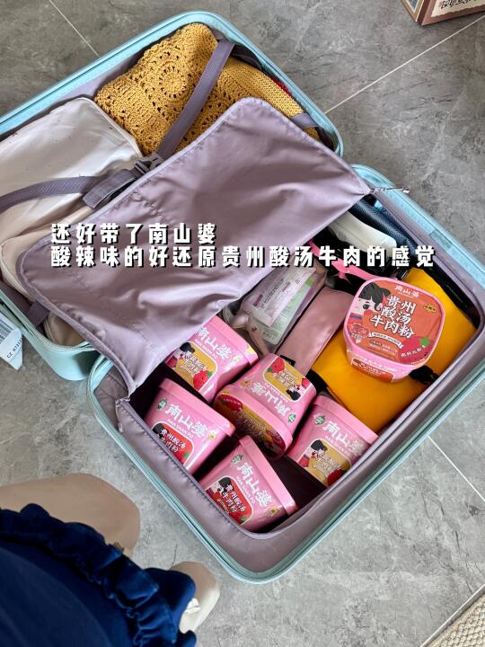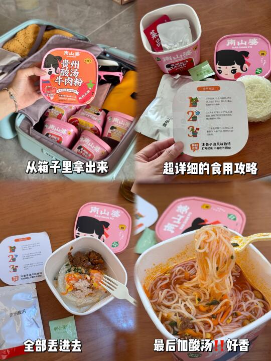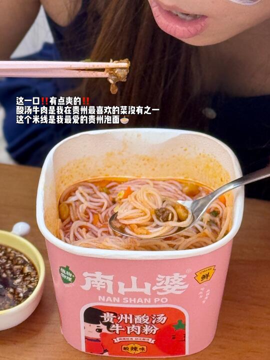 这次带了几盒南山婆酸汤牛肉粉,用矿泉水或过滤水(印尼其他水轻易不要喝)冲泡7分钟就可以吃啦🍽️真的很爱贵州这一口酸汤🍜粉也很丝滑Q弹(米粉脑袋,直接吊打印尼一众泡面)而且自带的牛肉真的!米粉和牛肉的搭配,热量很低!✨