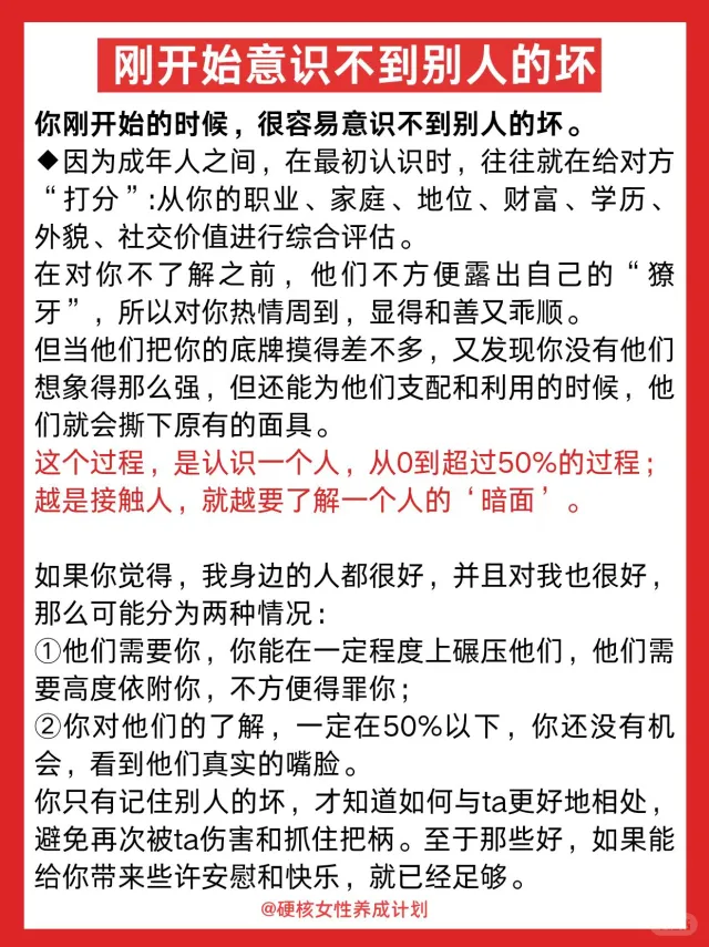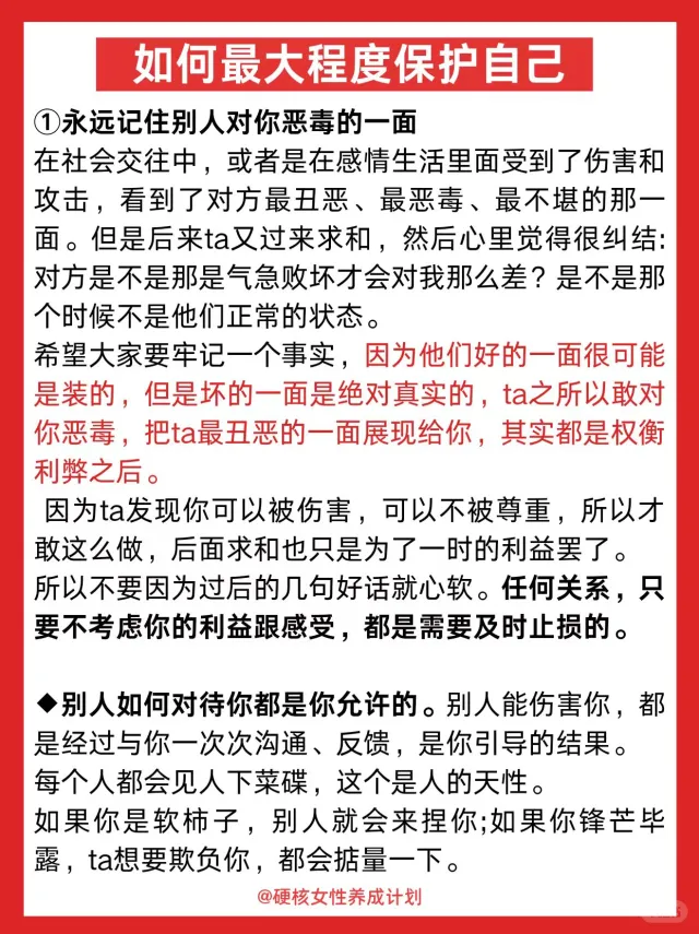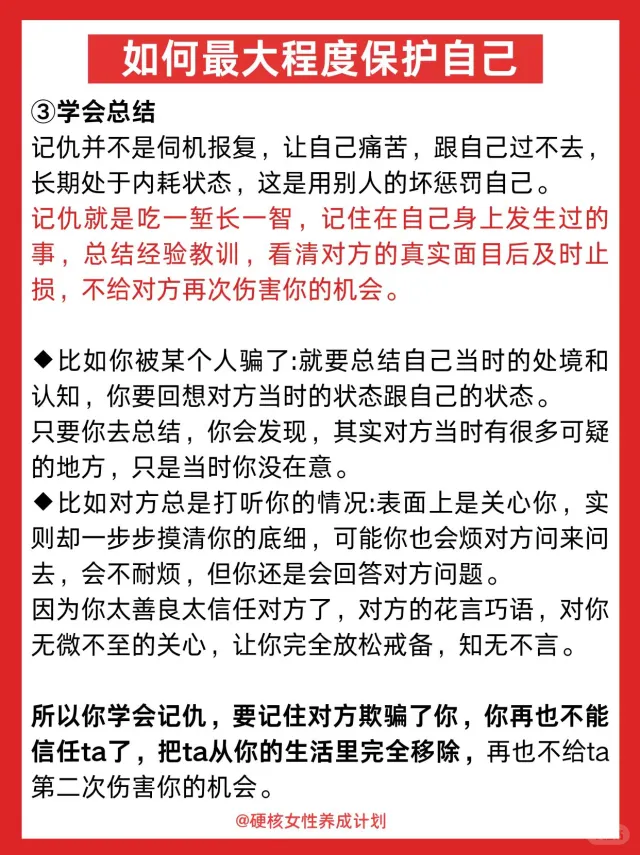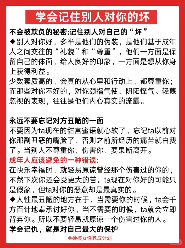 不被人欺负的秘密:学会“记仇”。 请你务必记住别人对你的“坏”,记住ta丑陋的一面,不要因为几句好话就心软。别人对你的好也许是装的,但是恶一定是真的。