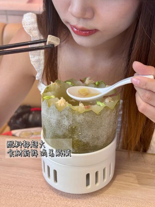 冬瓜盅本身就是一道超有名的消暑粤菜,熬好的骨汤放进定制种植的绿玉小冬瓜里再蒸煮,里面还放了夜香花,真的食材又新鲜又消暑解腻!咕噜鸡球也是很爽口的,酸酸甜甜的,超级好吃!而且大家乐的分量就是刚刚好,所以和朋友来可以一次点几份!吃到不一样的粤菜名宴!