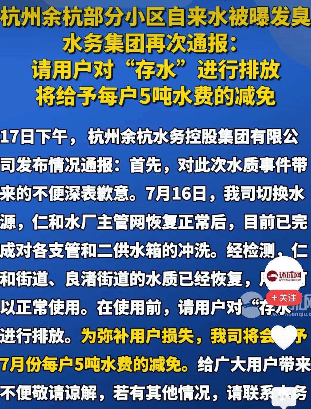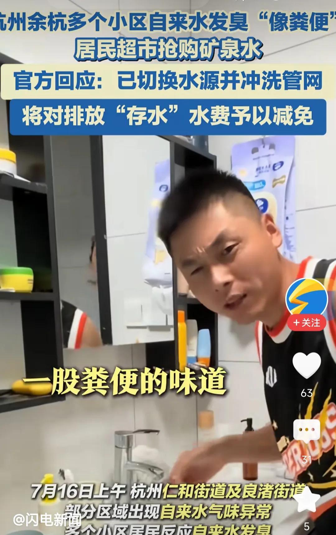 7月16日傍晚杭州余杭区出公共安全事故。 多个小区自来水发臭,颜色和味道类似粪便
