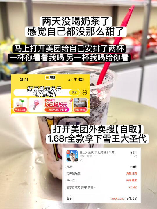 谈恋爱嘛易如反掌 快把男朋友钓成翘嘴了 天天熬夜背梗哄男朋友开心真是辛苦本美女了 奖励自己两杯奶茶喝喝不过分吧 感谢美团外卖和蜜雪冰城强强联合 让我这个夏天实现了奶茶自由! 7.19-7.20上美团外卖🔍【自取】1.68r拿下雪王大圣代 还有1.68r的茉莉绿茶 1.68r的青提肉多多 2.9r的棒打鲜橙 2.9r的茉莉奶绿、2.9r的蜜桃四季春! 价格简直逆天啦 两三块钱就能美美喝上奶茶 真的爽爆了~