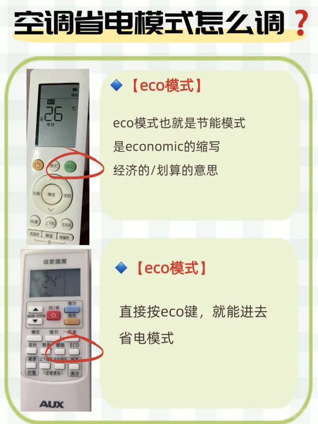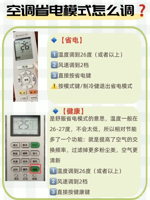 每个遥控器的型号不一样,不过逻辑大同小异,看到【健康】【省电】【节能】【经济】【eco】这几个字眼的,就算是省电模式,贴心如我,把市面上常见的几种遥控器都扒拉来了,大家对照着去调就行