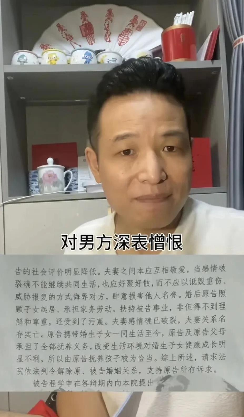 海南陵水官员出轨人妻事件后续来了,大家还记得湖南长沙有一位叫“程度先生”的网友实名举报妻子出轨官员的事情吗? 虽然涉事的官员,海南陵水官员肖峰已经被撤职,双开追究刑事责任,但是这个家庭也是彻底毁了。 据程度先生发布视频称,让他没有想到的是,居然是出轨的女方首先对他进行了起诉。要求离婚,和将两个孩子判给女方抚养,并且要求男方每个孩子给一个月2000的生活费。 最关键的是,在起诉书里,陈某月对丈夫是怨气很大,也透露了自己疑似出轨的原因,是和丈夫感情破裂,说结婚后程某多次创业未果,没有任何收入,并消耗家庭存款,不给家里生活费,不给孩子抚养费,不补贴家用,还经常吵架等等,还揭露曝光她,让她的社会评价降低。 然后就是孩子一直由女方照顾,女方的父母也一直照顾孩子等。 看到这个起诉书直接把男方气的够呛,就差直接说男方不挣钱她要出轨了。 真实的情况是,程度做教育培训还是挣了不少钱的,不然也不会同意陈某拿出20万借给朋友周转。 两人的感情在此之前也是不错的,最主要的还是被人画了大饼。 这次,程度也彻底死心了,知道陈某是根本没有后悔,只是狠被抓到了,两人最主要的还是孩子抚养权的问题。