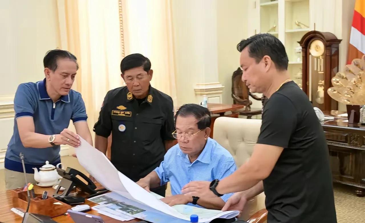 柬埔寨的实际权力掌握在洪森手里实锤了,虽然说洪森已经退休了,不过柬埔寨的大事还是他说了算。 在泰柬边境开战之际,为了稳定柬埔寨军心民心,洪森发布了几个图片。在洪森身旁有柬埔寨的国防部长,情报局长,武装部门等官员,洪森拿着放大镜一边观看地图,一边听汇报。 这个办公室也成了柬埔寨的最高作战指挥部,在洪森的办公桌上放着4部手机,这些也是洪森对外沟通指挥忙碌的证据。 目前来看,柬埔寨其实准备的比泰国充分,据泰国媒体称,泰国已经有10多名平民和多名士兵伤亡,而柬埔寨关于伤亡的信息还没有报道。 之所以这么公布出来,洪森想要表达的也不外乎几个意思,一个是柬埔寨虽然国力不如泰国,但是也很强硬,会团结一心来反击泰国,另外就是洪森是柬埔寨的有力保护者。 #柬埔寨首相洪森# #柬埔寨#