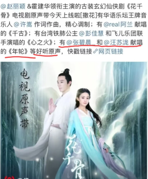 2015年7月,QQ音乐正式上线《花千骨》电视原声音乐,其中明确写了张碧晨和汪苏泷献唱的年轮。