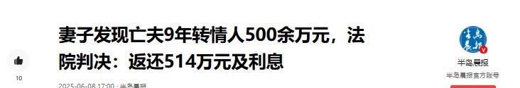 四川雅安,一女子在丈夫病逝4个月后,发现他的“惊人秘密”,他竟在9年前就背叛了自己,给情人转账102次,共计555.49万元,她和丈夫夫妻40多年,他却背着自己,把他们辛苦挣得钱便宜了第三者,女子愤怒的把第三者告上法庭,要求全数返还,而第三者的解释让女子怒火中烧,法院判决也意想不到。 “我陪你创业,陪你吃苦,可你却背着我给其他女人转账!还是500多万!你的良心呢,对得起我吗?”女子坐在墓地,对着一墓碑痛哭的说道。 这个墓是她丈夫的,刚去世4个月。女子本想着和丈夫在一起几十年,经历了风风雨雨,以为能携手走完这一生,没想到丈夫提前走了,病逝了,她很难过,为了将丈夫的后事安排好,大大小小的事情她都亲自操劳,只为丈夫能安息。 丈夫去世后,她一个人过的特别辛苦,生意上的事情都得忙着处理。以前他们俩穷的时候,大晚上骑电车回家,淋过雨,受过冻,住过几平方米的出租屋,好在俩人没有放弃,咬着牙挺了过来。 他们慢慢有了积蓄,买了大房子,开上小轿车,可以说日子好起来了,没想到丈夫还没好好享福就离开了,一想到这些女子就很痛苦,她逼着自己工作,因为只要工作起来了,她就没有心思想别的事情。 然而,她怎么都想不到,因调取银行流水竟查出丈夫“惊人秘密”!! 女子生意上发生了一些事情,需要调取银行流水,还有微信转账记录,可就在这时候,她发现丈夫频繁给一个账户转钱,关键是金额不少,555.49万元! 连续9年向一个账户转钱,收款的人究竟是谁?女子开始调查这件事,她从来不知道丈夫给谁转账了,也没听丈夫说过,更没在意过丈夫花多少钱,花在哪里了。 当她调查一番后,发现收到转账的人是一个女人!也就是说丈夫和这个女人从2014开始一直到2023年都在联系。她的丈夫是在2024年病逝的,后面他们就没了联系,关键是也联系不上了。 女子特别难受,没想到会发现这样的事情,一时间她觉得自己像个笑话,被蒙在鼓里这么长时间,竟然一点蛛丝马迹都没发现,自己陪着丈夫吃苦,熬过那么多苦日子,可其他女人却可以享福,什么不用干就能拿到这么多钱! 于是女子联系上这个女人,要求她还钱,可是这个女人哪会把钱还回来啊,她觉得这是自己的钱,不会归还。 女子不想和她废话,直接将她告上法庭,如果没有证据女子也不会找这个女人,因为她在丈夫的手机里发现了俩人的聊天记录,亲密照片等等,所以这些足够证明他们俩的关系。 这个女人在看到这些的时候,还狡辩不承认,但这时候不是她想怎样就怎样的。女子强烈要求她归还收到的所有钱。 最终法院判处女子归还514万以及利息。 网友们看后纷纷表示,投机取巧,不义之财终得归还。正义的判决。为法官点赞!希望和男子联系的女子明白,不要插足别人的感情和生活,不然拿到的钱早晚都得还,没有好下场。