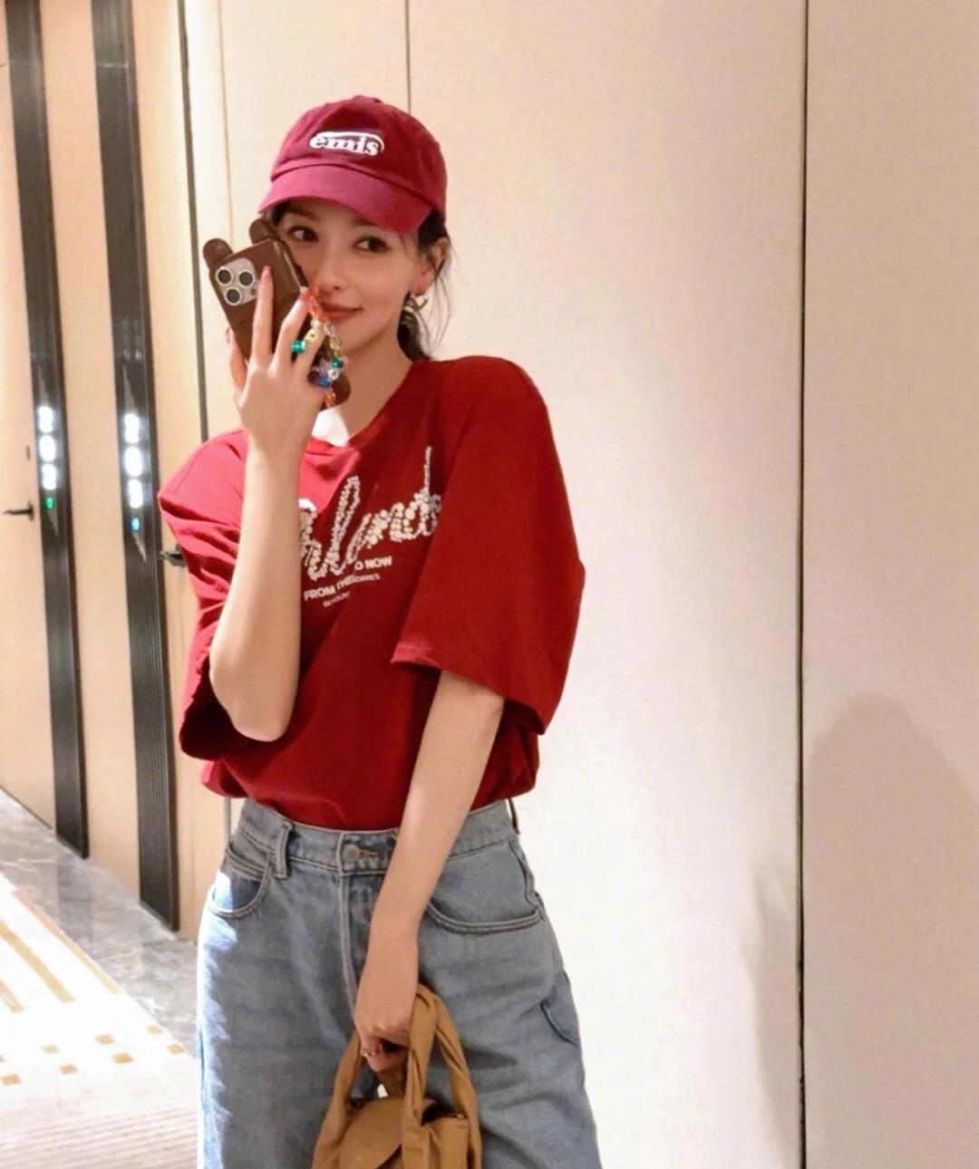 唐嫣这次穿搭很有少女感! 红色的字母T恤,搭配一条高腰的蓝色牛仔裤, 头戴红色棒