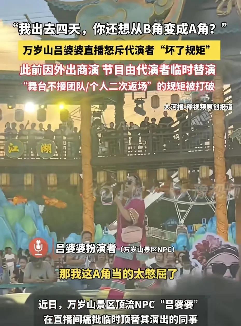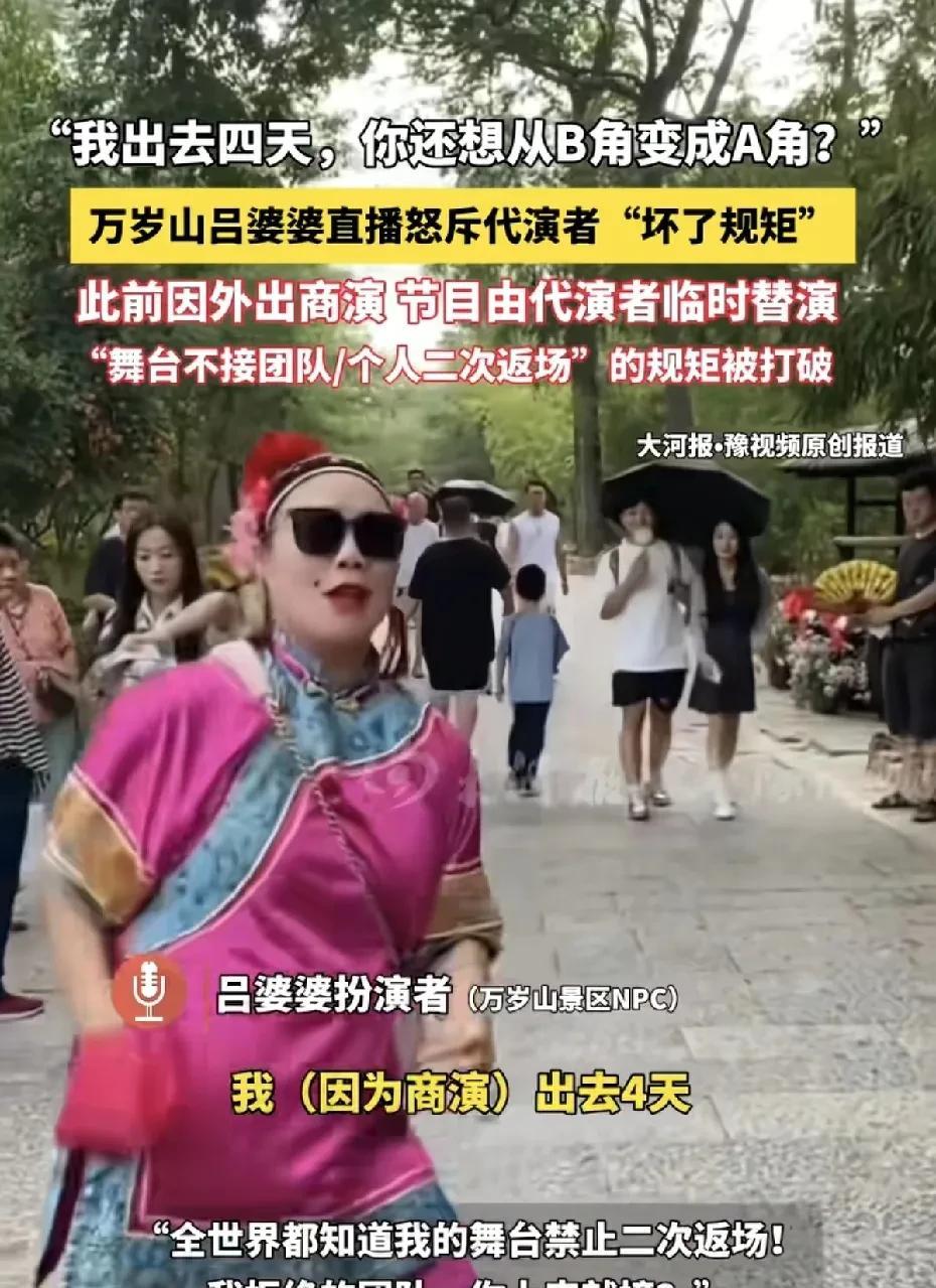 开封万岁山景区著名NPC扮演者吕婆婆发声,称自己外出商演4天,回来发现自己的替代者(代演者)打破她的规矩,“我的舞台禁止二次返场,我拒绝的团队,你上来就接,指责代演者,想从“B”角转成“A”角,如果自己不出来说几句,自己的“A”角当的太憋屈。 大概的意思就是,吕婆婆扮演者有自己的一套规矩,但是自己出去4天商演,自己的替代者给的改变了,两者有了矛盾,吕婆婆的扮演者认为替代者想挑战她的地位之类的。 简单就是,有人的地方就有江湖,有利益的地方就有纷争。 #万岁山开封# #吕婆婆斗舞# #吕婆婆逗舞#