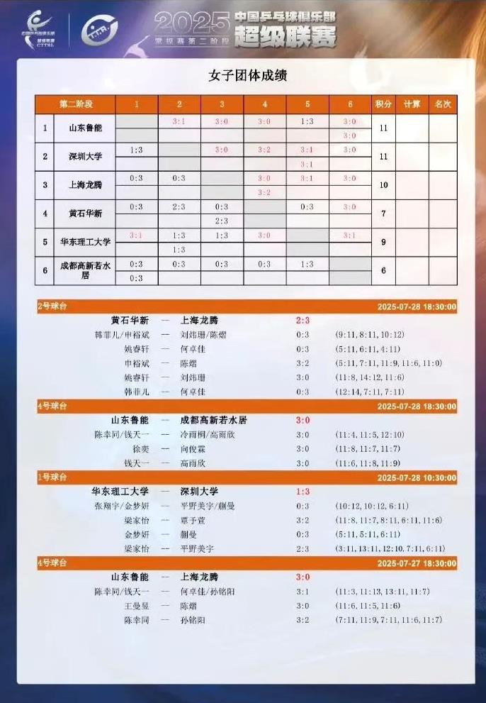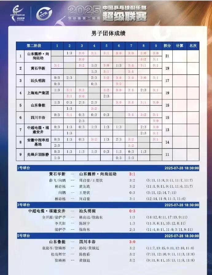2025乒超联赛第二阶段后结束后的积分情况: 【男子】 山东魏桥:10胜1负(21分) 上海地产集团:8胜3负(19分) 黄石华新:8胜3负(19分) 汕头明润:6胜5负(17分) 山东鲁能:5胜5负(15分) 四川丰谷:5胜5负(15分) 安徽中程:4胜6负(14分) 中超电缆:2胜9负(13分) 先锋乒羽:0胜11负(11分) 【女子】 山东鲁能:5胜1负(11分) 深圳大学:5胜1负(11分) 上海龙腾:3胜2负(8分) 华东理工:3胜3负(9分) 黄石华新:1胜4负(6分) 成都高新若水居:0胜6负(6分) 2025.7.28