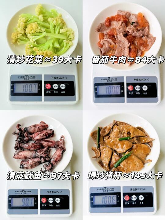✨炒花菜:39大卡 ✨爆炒猪肝:145大卡 ✨番茄牛肉:84大卡 ✨清蒸鱿鱼:97大卡 以上是100g家常菜的量,大概可以吃图片所示那么多 减脂期一餐建议是控制在500大卡左右, 据此大家可以大概参考下100g的量……另外还想知道什么可以再↓滴滴哟!