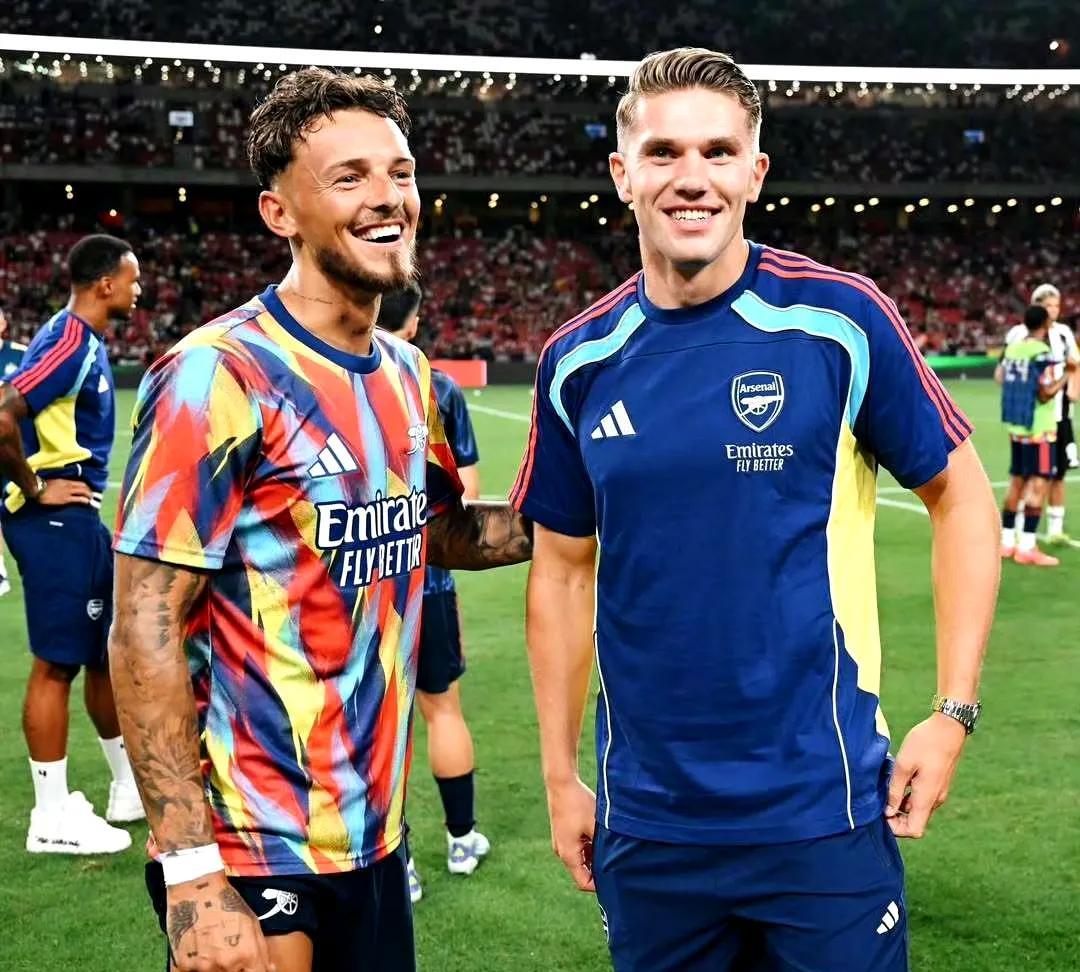 阿森纳后卫怀特和新援前锋哲凯赖什在阿森纳重聚了,因为他们都曾经效力于布莱顿青年队,估计他们要喝两杯庆祝庆祝了。