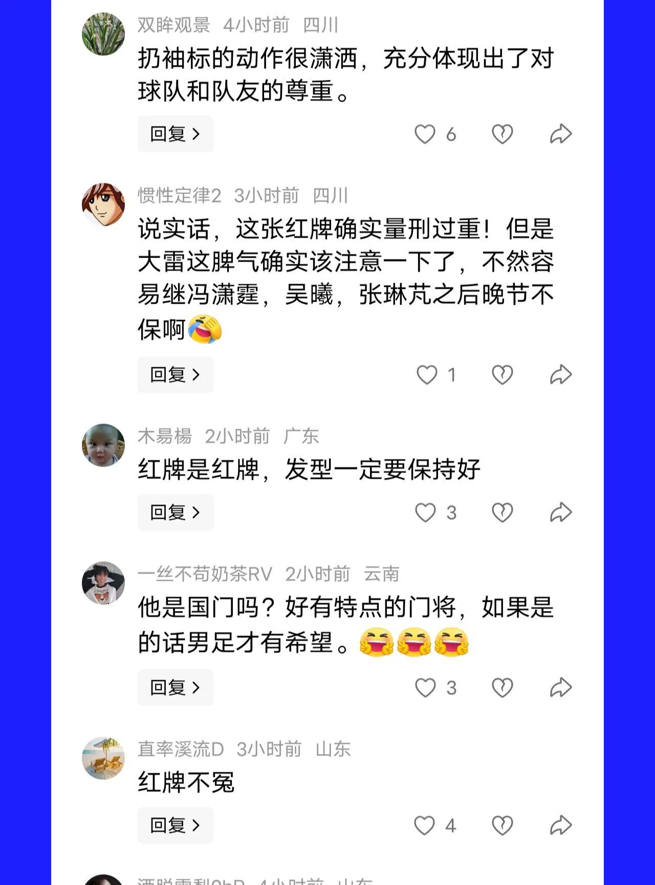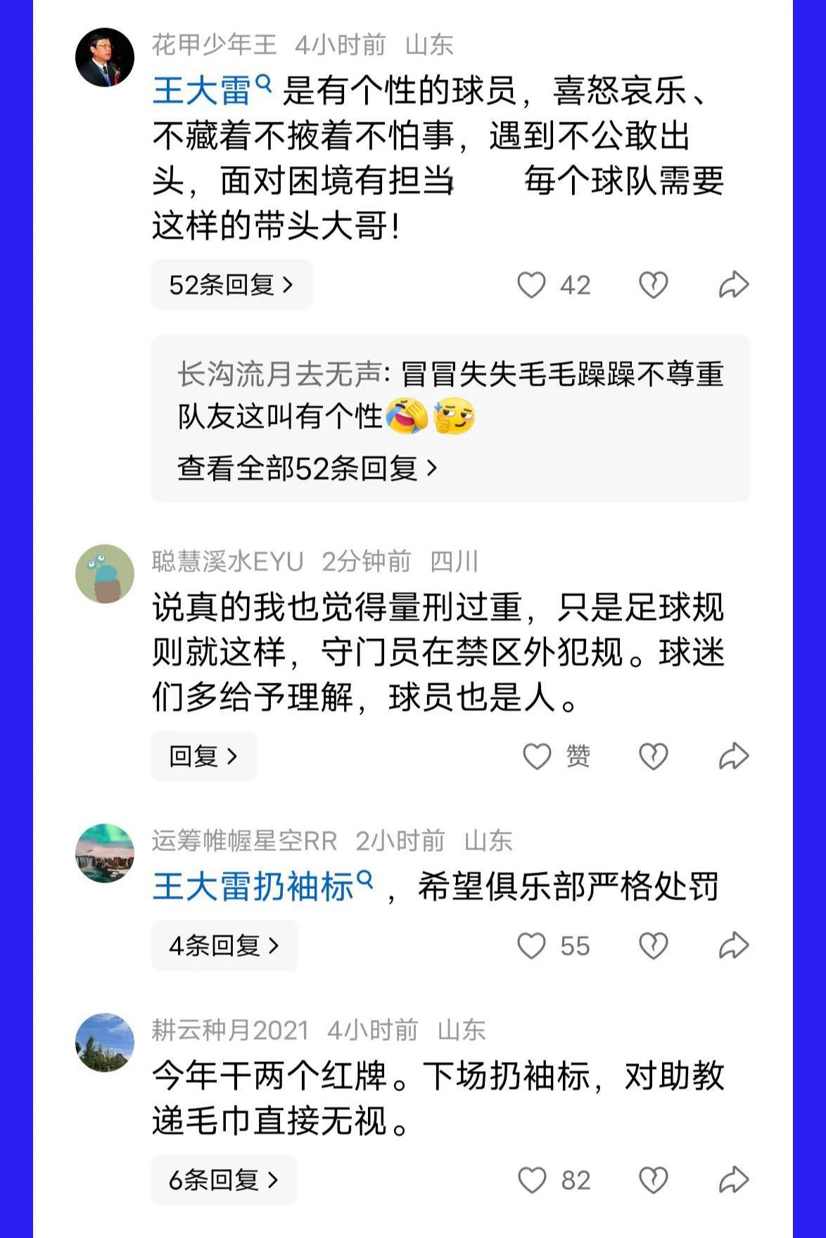 王大雷怒气下场,队长袖标扔地上,这一举动比红牌被罚下场还让球迷热议,国门的素质在哪里? 随着中超的冠军争夺愈演愈烈,中国足协开始在重要场次安排外籍裁判,很显然,这是一种进步。 当然,这同时也是一种无奈之举,中国足球令人诟病的地方太多了,其中就包括裁判的执法水平、职业涵养、以及这样那样的场外因素对裁判的影响。 毋庸置疑,昨晚山东泰山对阵成都蓉城的裁判是公正的,也是极其严格的,退一步说,如果是国内裁判,王大雷99.99%不会红牌,黄牌是基本操作。 面对汹涌澎湃的舆论,王大雷今天在自媒体平台做出了回应:“可以啊,你们喜欢在网上猜测‘王大雷扔袖标’?” 意思非常明显,王大雷的潜台词是不是“扔”,而是不小心掉地上了,这种可能性也是有的。 山东球迷说到:“王大雷是有个性的球员,喜怒哀乐、不藏着不掖着不怕事,遇到不公敢出头,面对困境有担当……毎个球队需要这样的带头大哥!” 四川球迷表示:“说实话,这张红牌确实量刑过重!但是大雷这脾气确实该注意一下了,不然容易继冯潇霆,吴曦,张琳芃之后晚节不保啊。” 上海球迷认为:“观察目前的国际国内形势,王大雷真的没有什么念想可得的,也是自己退出来另谋出路的时候到了!王大雷本场的红牌,增加了的中超冠军悬念,促进了北京丶重庆丶上海的球市,同时也会提升点市场消费,这就算是王大雷对中国足球做出的最后一份贡献。”