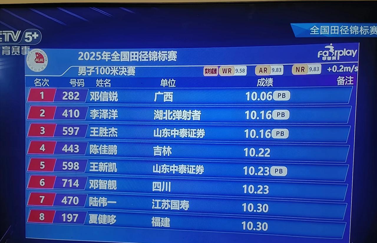 邓信锐已经预定了下一个百米破百的席位,成为中国男子百米短跑第三人! 起跑就领先,中途加速有力,后程顶得住别人冲击,现在的邓信锐全程已经无懈可击,十分完美,如果非要挑刺的话,就是在80米以后的冲刺阶段还需好好打磨,如果再这个阶段还能更进一步,破10秒指日可待,跑到9秒95是完全可以的。