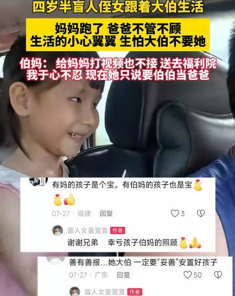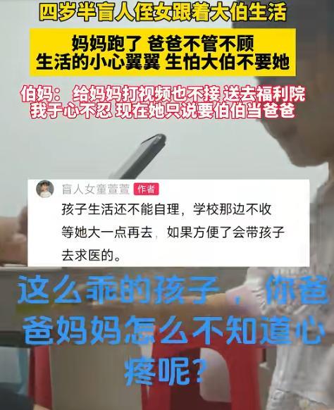 “这样的大伯伯妈太伟大了!”4岁半的女盲童,实在太可怜了,妈妈跑了,爸爸把她丢到大伯家不闻不问,女童害怕大伯伯妈不要她,过得小心翼翼的,却不知大伯大妈看着她,都很心疼她,伯妈更是给她亲妈打了无数个视频,就想让孩子听听妈妈的声音,但亲妈都没有接,伯妈看着懂事的孩子,想不到她为什么会有这么狠心的爸爸妈妈。 据商丘网络电视台报道,有个叫萱萱的小女孩,才4岁半,眼睛看不见,还是个盲童。让人心里不是滋味的是,这么小的孩子,不在爸爸妈妈身边,反倒跟着大伯一家过生活...... 刚开始的时候,周围人都以为萱萱的爸妈可能不在了,是大伯心眼好,收留了这个可怜的孩子。可慢慢了解下来才知道,其实萱萱的爸爸是因为家里条件不好,大伯一家看着孩子没人管不行,就主动帮忙照顾萱萱。 谁也没料到,这时间一长,萱萱的爸爸就彻底不管不顾了,别说来看看孩子,就连个电话都不打,好像这孩子跟他没关系似的。 萱萱的妈妈就更过分了,觉得家里太穷,看不到一点盼头,干脆就走了,把这么小的孩子扔下不管。萱萱心里其实一直惦记着妈妈,有时候会小声念叨着要找妈妈。 伯妈看孩子这样,心里也跟着难受,就想着帮孩子联系上妈妈,哪怕让孩子听听妈妈的声音也好啊。于是伯妈试着给萱萱的亲妈打了无数次视频电话,可每次对方都没接,就这么一次次凉了孩子的心,也凉了伯妈的心。 伯妈看着萱萱那懂事又可怜的样子,心里直犯嘀咕,真想不明白,怎么会有这么狠心的爸爸妈妈,能对自己的亲生骨肉不管不顾...... 在大伯家的日子里,萱萱过得特别小心翼翼。她好像总怕自己做错什么,生怕说句话不对,或者不小心做错一件事,大伯大妈就会不要她,把她赶出去。这孩子心里肯定琢磨着呢,要是真被赶走了,自己都不知道该往哪儿去,世界这么大,她一个看不见的小娃娃,能有什么地方可去呢。 不过萱萱这担心真是多余了!大伯一家根本不是那样的人。大伯从来没因为萱萱是个盲童,或者觉得她是个累赘就对她不好,反而总是记着给她买新衣服,平时生活里更是处处关心她,冷了热了都挂在心上,从来没对她厉害过一句,连大声说话都没有过。 大伯两口子心里都清楚,这孩子太可怜了,打小就看不见,爸妈又不管她,他们要是再不对她好点,孩子就真的太苦了。 周围其实有不少人给大伯一家建议,说不行就把萱萱送到福利院去吧,那里或许能有更专业的人照顾她,他们也能轻松点。可大伯一家想都没想就拒绝了,他们觉得福利院再好,也比不上家里温暖,孩子在那儿肯定不如在自己家里过得舒心!他们就想着,自己苦点累点没关系,只要能让萱萱有口饭吃,有个遮风挡雨的地方,能平平安安长大就行。 现在萱萱的情况也挺让人操心的,因为眼睛看不见,生活上很多事都不能自理,想送她去学校,学校那边也没收,只能先在家里由大伯大妈照看着,等孩子再长大一点,情况好一些了,再考虑上学的事。 大伯大妈也没放弃让萱萱重见光明的可能,他们说以后会带着孩子去治疗,不管有多难,都想试试,万一能治好呢,不能让孩子一辈子活在黑暗里。 可能是大伯大妈对萱萱是真的好,好得让萱萱打心底里依赖上他们了。萱萱经常说,让伯伯当自己的爸爸。这话听着简单,却让大伯大妈心里又酸又暖,觉得自己的付出都值了。 这事被网友知道后,大家都议论开了。好多人说,萱萱这孩子真是太可怜了,小小年纪就遭了这么多罪,不过幸亏遇到了好大伯和好大妈,不然这孩子可怎么办啊,都纷纷给大伯大妈点赞。 还有不少人关心萱萱的眼睛,说要是这孩子的眼睛有希望治疗复明,真想知道得花多少钱,大家可以一起捐捐款帮帮她,孩子这么小,以后的路还长着呢,可不能一直看不见啊。 不知道大家看完萱萱的事,心里是什么感受呢? 是觉得大伯大妈特别让人敬佩,还是心疼萱萱的遭遇,又或者有什么别的想法,可以在评论区说说,我们一起聊一聊!
