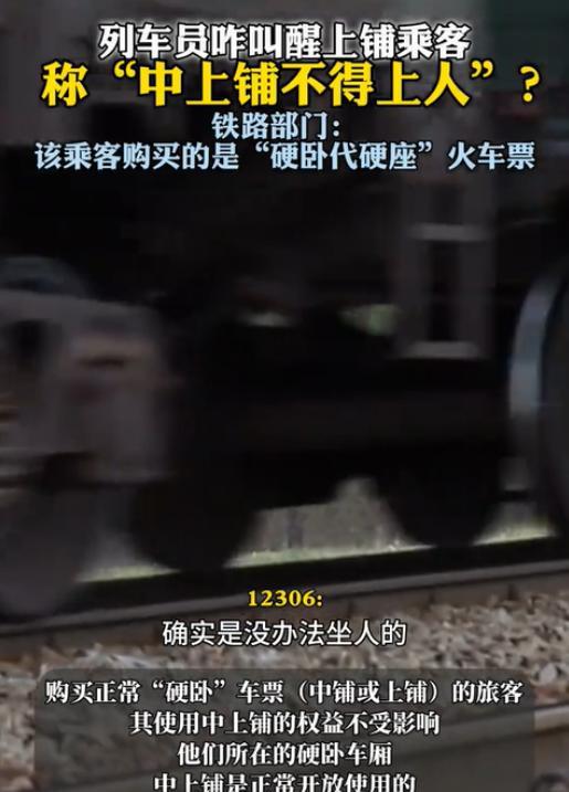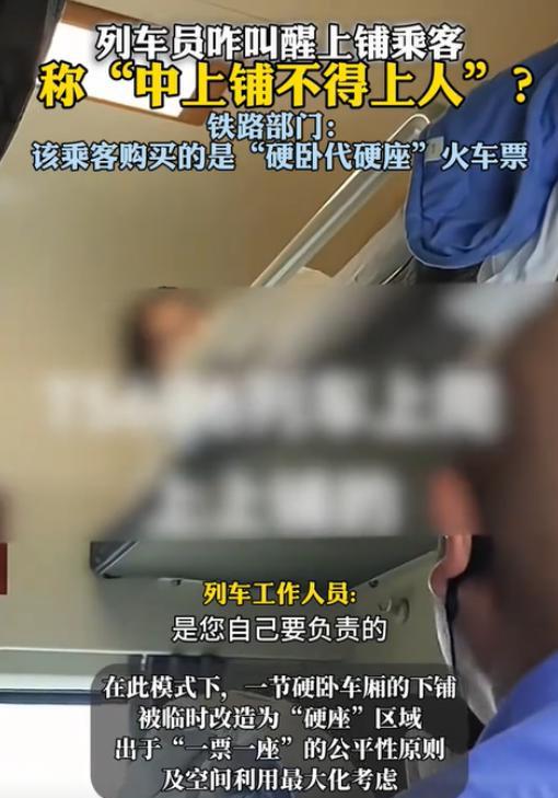 北京,一女乘客躺在硬卧上铺休息时,突然被列车员叫醒,称中上铺不能上人。女乘客感到十分气愤:“我都买了票了,为何不能睡上铺?”可列车员却表示这是规定。 据经视直播8月1日报道,在一趟从秦皇岛开往北京的列车上,发生了一件让女乘客颇为气愤的事!当时,女乘客正躺在硬卧上铺舒舒服服地休息,沉浸在自己的梦乡中。突然被一阵急切的呼喊声吵醒。刚开始女乘客迷迷糊糊的,还以为是同车厢的乘客丢了什么重要东西,把列车员找来了。 可接下来列车员的话,让她瞬间清醒,还怒火中烧。列车员告诉她,中上铺不能上人,让她赶紧下来换个地方。 女乘客满心都是不解和愤怒。自己花钱买了票,凭啥不能睡上铺呢?这上铺装在这儿难道就是个摆设吗?她越想越气,毕竟以往每次坐车,都没碰上过这种事儿,怎么偏偏这次就不行了呢?女乘客忍不住嘟囔,这规定也太不合理了吧。 原来,女乘客购买的车票是 “硬卧代硬座”类型。可能很多人不太清楚这是什么意思。简单来说,在运输高峰期,或者座位特别紧张的时候,铁路部门就会采用这种“硬卧代硬座”的方式来缓解运力压力。 具体做法就是,把硬卧车厢的每个下铺当成4个“硬座” 来安排乘客。这样一来,原本只能睡一个人的下铺,就能让4个人坐着了。 至于为啥不让睡上铺,列车员也给出了解释。工作人员表示,这是为了大家的安全着想。想想看,上铺离地面挺高的,年轻人身手敏捷,爬上爬下可能没什么问题。但要是上了些年纪的人,体力和灵活性都大不如前,从上铺下来的时候,万一不小心踩空摔倒了,那后果可不堪设想。 所以,为了避免这种意外情况发生,铁路部门才规定在“硬卧代硬座”的车厢里,不允许乘客躺卧中上铺。 这件事在网上传开后,网友们纷纷发表自己的看法。有人觉得列车员做得没错。他们认为,列车员首先得跟旅客说明白,买的是硬座票,就不能躺硬卧。要是旅客明知故犯,那就应该先好言劝告,要是不听,再进行相应处罚。毕竟列车员也是在执行规定,保障列车的正常秩序和所有乘客的安全。 可也有人站在女乘客这边。他们觉得,客运高峰期铁路部门把硬卧车厢下铺用来提供给旅客乘坐,缓解压力,这出发点是好的。 但对于乘客来说,买了这种“硬卧代硬座”的票,心里肯定想着好歹是在卧铺车厢,结果连中上铺都不能用,确实会让人感觉不太舒服。而且大家买了票,就应该有相应的使用权,现在不让用中上铺,感觉像是权益受到了限制。 不管怎么说,乘客要理解工作人员,他们不让在上铺休息一定是有原因的,而铁路公司在制定规则的时候,应该多考虑一下乘客的感受,尽量找到一个既能保障安全和秩序,又能让乘客满意的平衡点。 那么,大家对这件事怎么看呢,欢迎一起讨论。