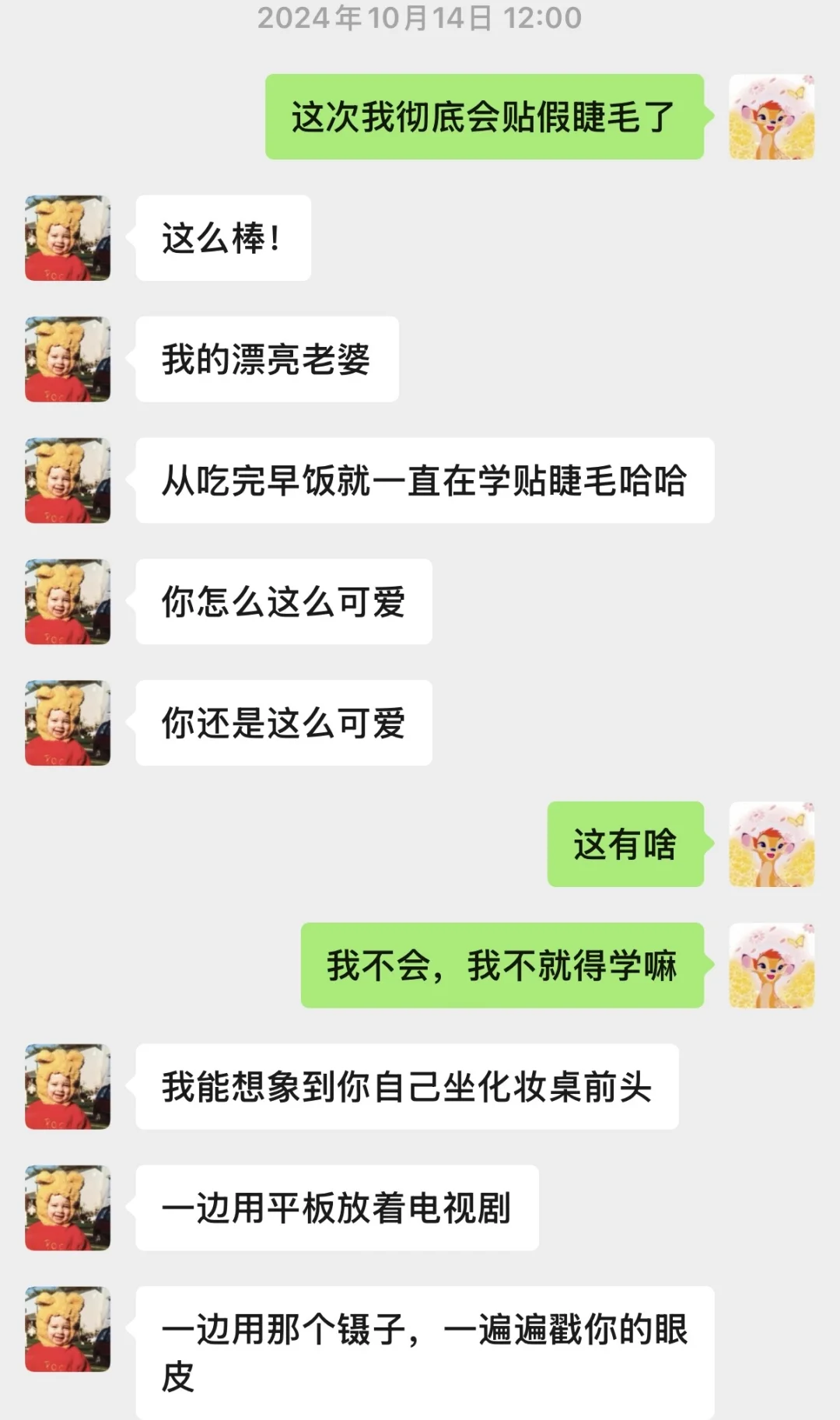 我第一次学粘假睫毛,睫毛胶蹭得眼下亮晶晶,他举着手机拍个不停,说可爱;