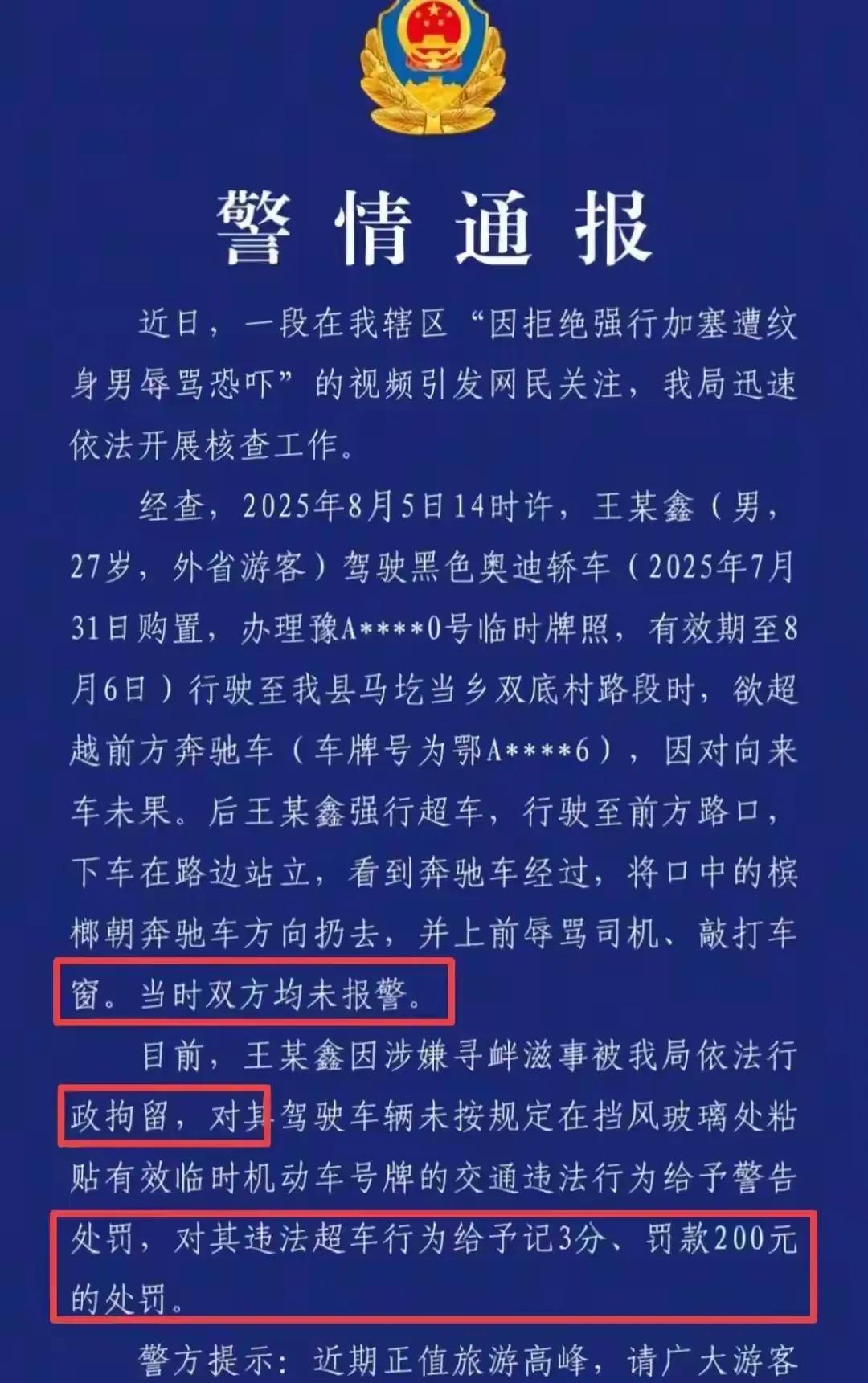 纹身男拦车骂人已被拘留,身份曝光,有打架斗殴前科! 8月5日,拦车骂人加塞的纹身