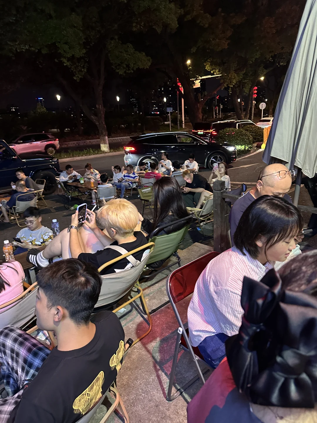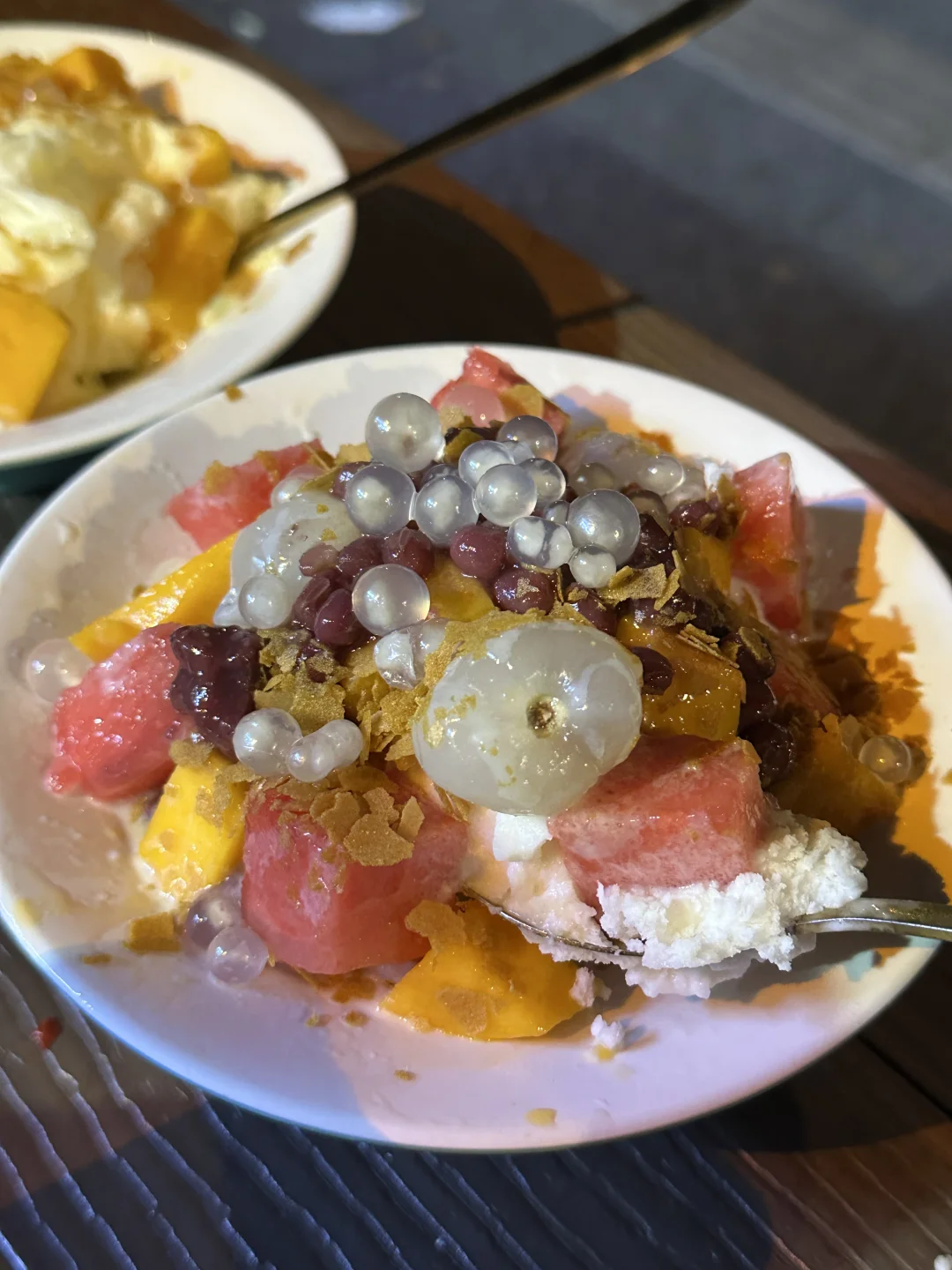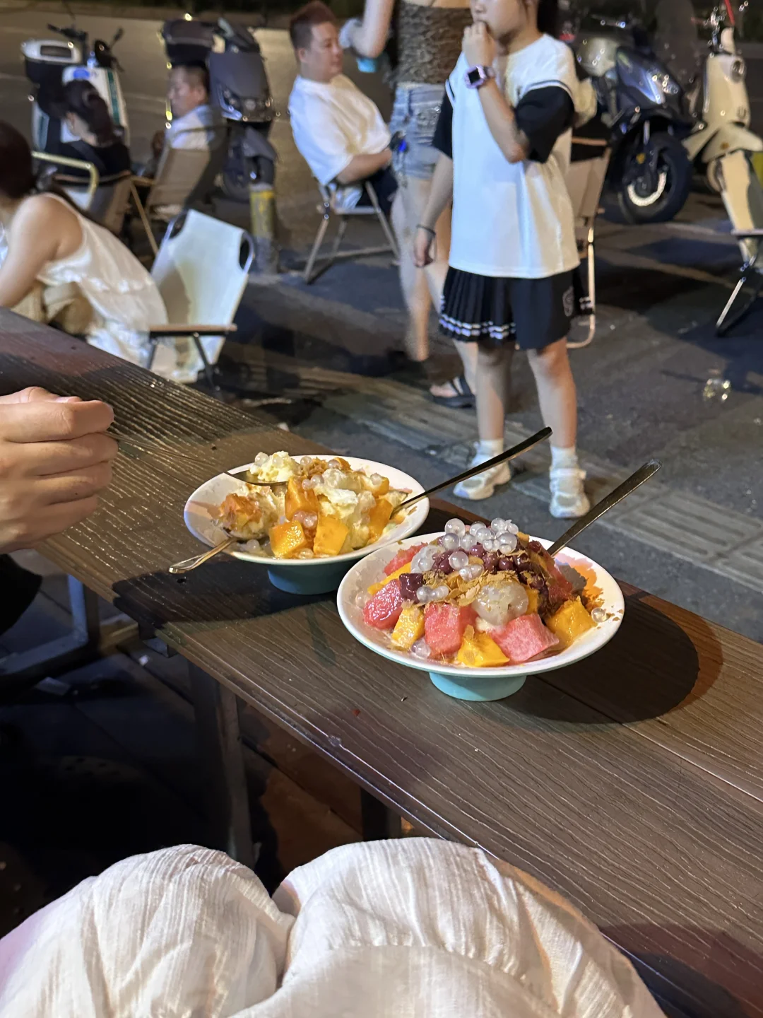 到了晚上很多人来。 刨冰就是很正常稳定的味道、 旁边的烧烤好吃、牛肉泡面一般(慎点) zui怕消失的应该就是他家的氛围感了、像海南的街边 清一色的年轻帅哥服务员~ 好多开跑车的年轻男女来吃。