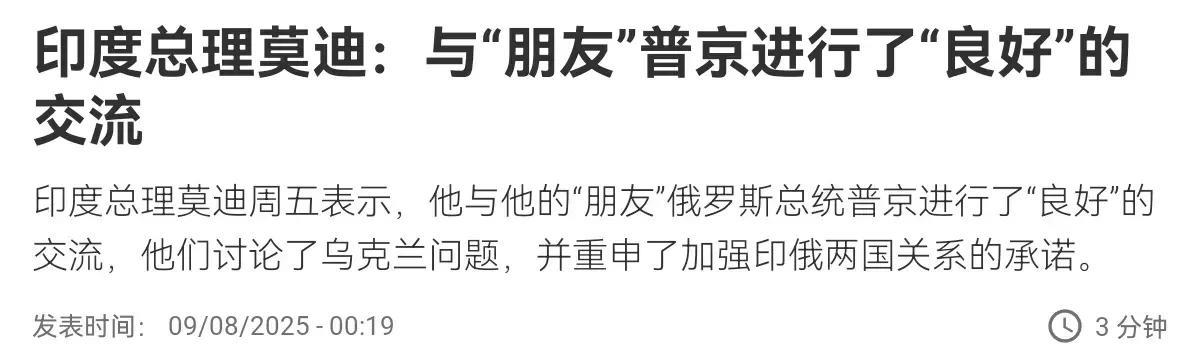 印度开始行动了!来自外媒8月9日消息说,印度总理莫迪公开表示,与印度的朋友普京进