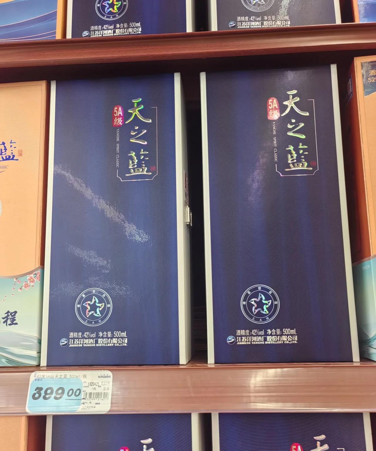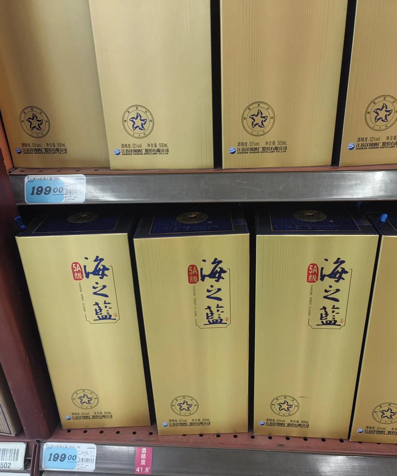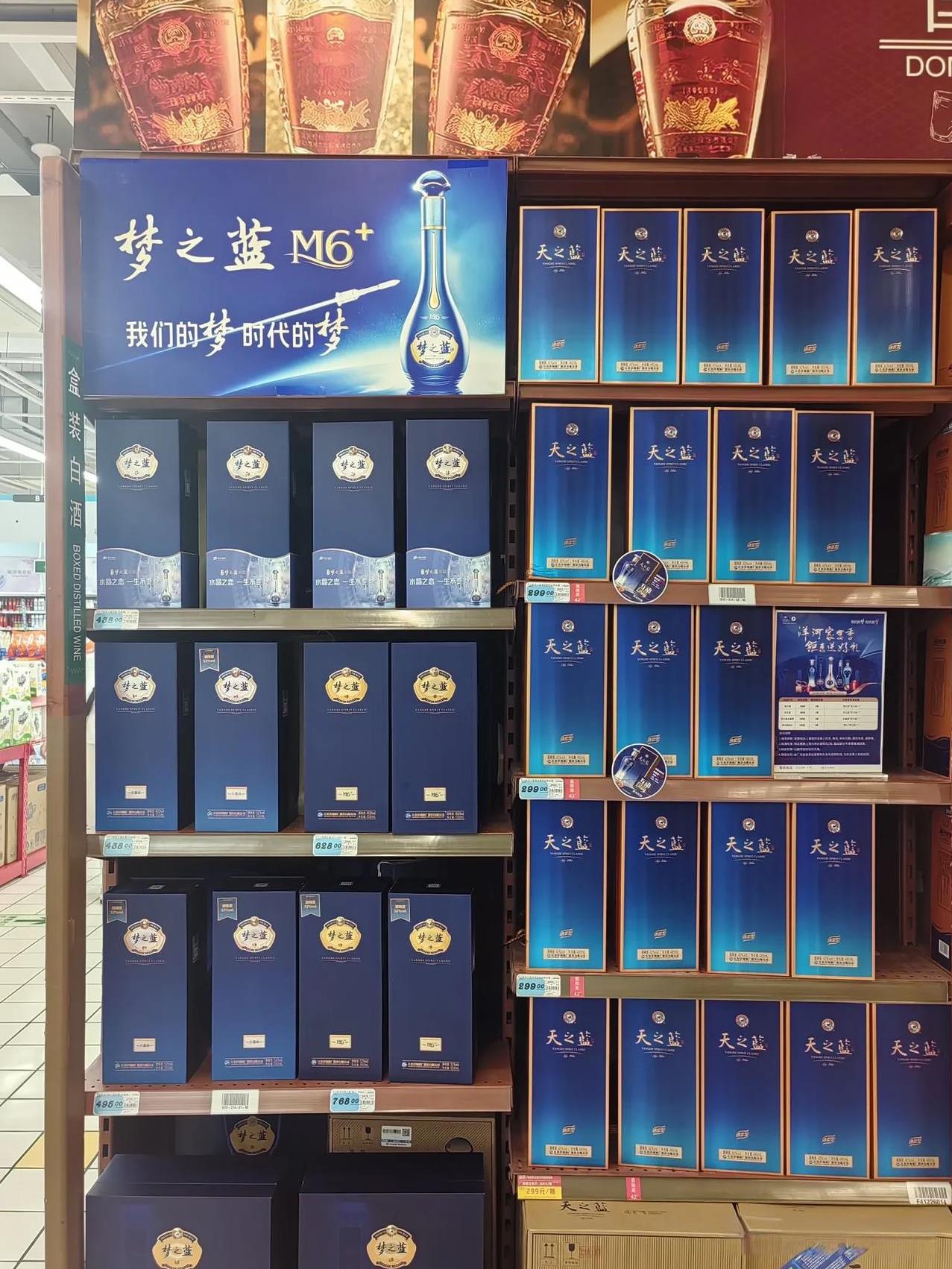 小张是驻南通地区洋河酒总代理商。上天跟我说洋河海之蓝第7代现在只是京东上有销售,包括宿迁市本地实体店及大型商超内均未上货,当时我是半信半疑。今天去南通市镇北路大润发店探店,果不其然!我把此店酒架扫了个遍,确实没有海7的影子。 从陈列酒架专区我们可以清楚看到,洋河系列酒占据专区大部分位置,像洋河海之蓝系列几个大类和5A级一应俱全有,梦3+至梦9+到天之蓝级别一应俱全。 和洋河酒紧挨着就是今世缘系列酒,但占用货柜只有一节,和省外酒占据位置差不多。 估计海7要不了多少天就会上市,让我们期待新一款既好喝,又便宜的洋河海之蓝第7代上市吧!
