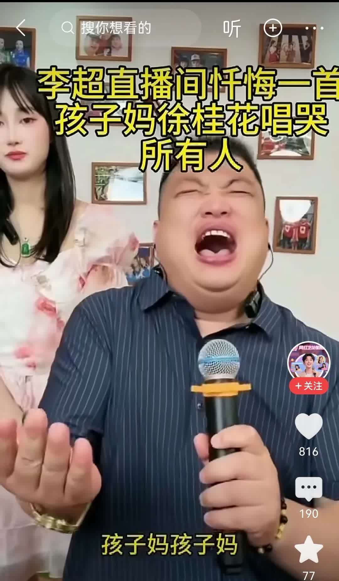 李超,疯劲过人,滑稽出众!居然当着小女友的面,喊天哭地,不停地哭着大喊:“孩子妈孩子妈,孩子妈徐桂花”!似乎离开了草帽姐十分后悔懊恼的样子,真不知这小子脑子怎么了,跟小女友在一起一会兴奋地大叫,一会又伤心地呼叫孩子妈徐桂花,一点也不顾小女友的感受!真是疯劲十足!