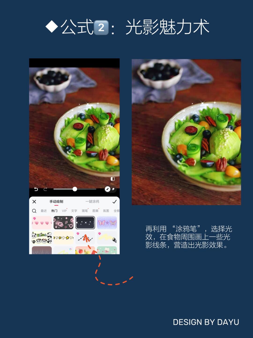 4⃣ 再利用 “涂鸦笔”,选择光效,在食物周围画上一些光影线条,营造出光影效果。