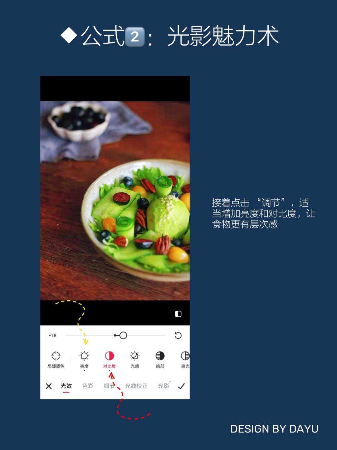 3⃣ 接着点“调节”,适当增加亮度和对比度,让食物更有层次感。