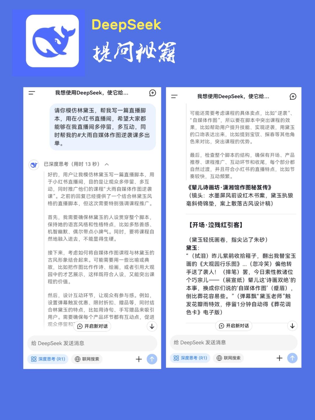 这么说比较空泛,我们举例来说哈,春晚上小品让黛玉在直播间带货,那么这和DeepSeek有啥关系呢,别急,别急,那我们就拿春晚上的黛玉直播举例: