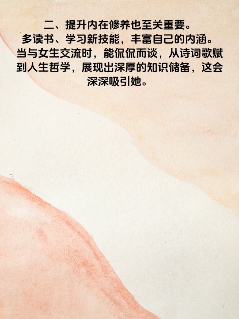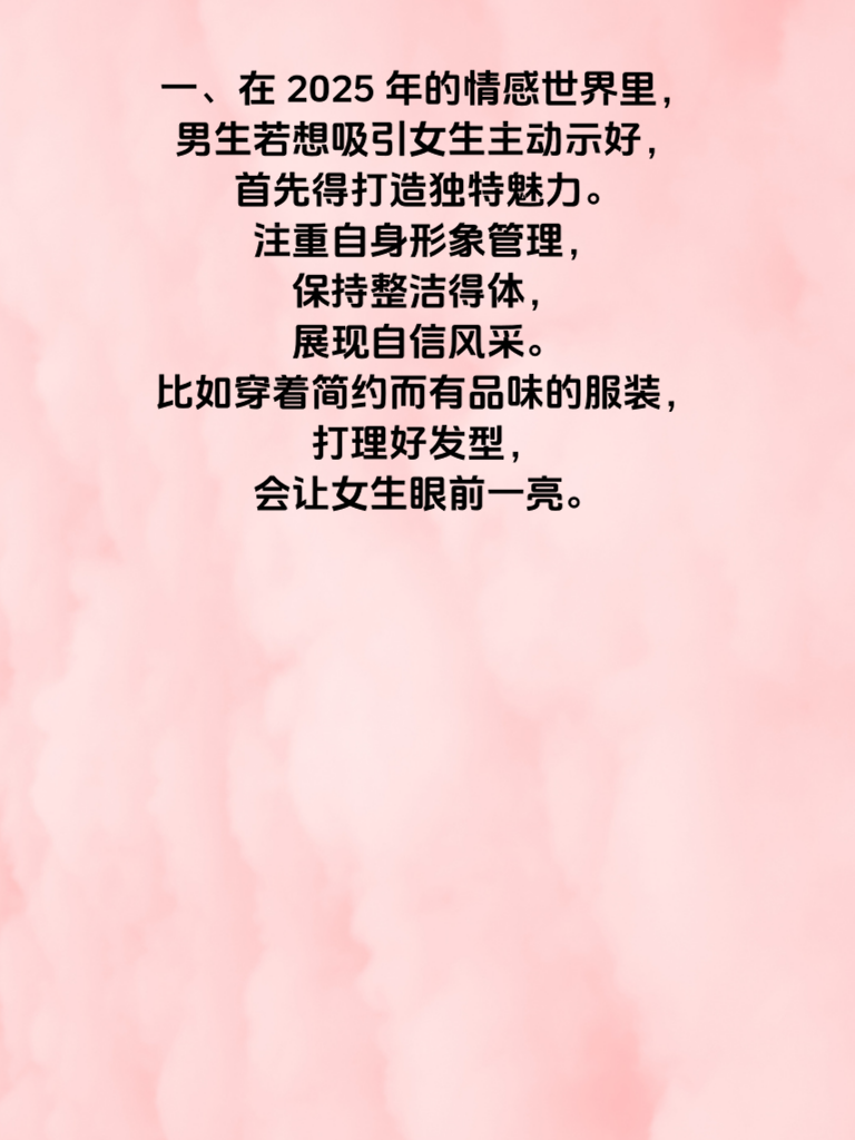 一、在 2025 年的情感世界里,男生若想吸引女生主动示好,首先得打造独特魅力。注重自身形象管理,保持整洁得体,展现自信风采。比如穿着简约而有品味的服装,打理好发型,会让女生眼前一亮。 二、提升内在修养也至关重要。多读书、学习新技能,丰富自己的内涵。当与女生交流时,能侃侃而谈,从诗词歌赋到人生哲学,展现出深厚的知识储备,这会深深吸引她。 三、积极参与社交活动,拓展社交圈。在各种场合中自然大方地与人交往,增加自己的曝光度。说不定她就在某个活动中注意到你,然后主动靠近。 四、对女生真诚且细心。记住她的喜好、生日等重要日子,适时送上贴心小礼物。比如她喜欢的一本书,或者一束她钟爱的花,让她感受到你的用心。 五、保持幽默风趣的态度。生活中适当开开玩笑,化解尴尬,营造轻松愉快的氛围。但要注意把握度,别让人觉得轻浮。如此这般,她很可能会主动向你抛出橄榄枝。