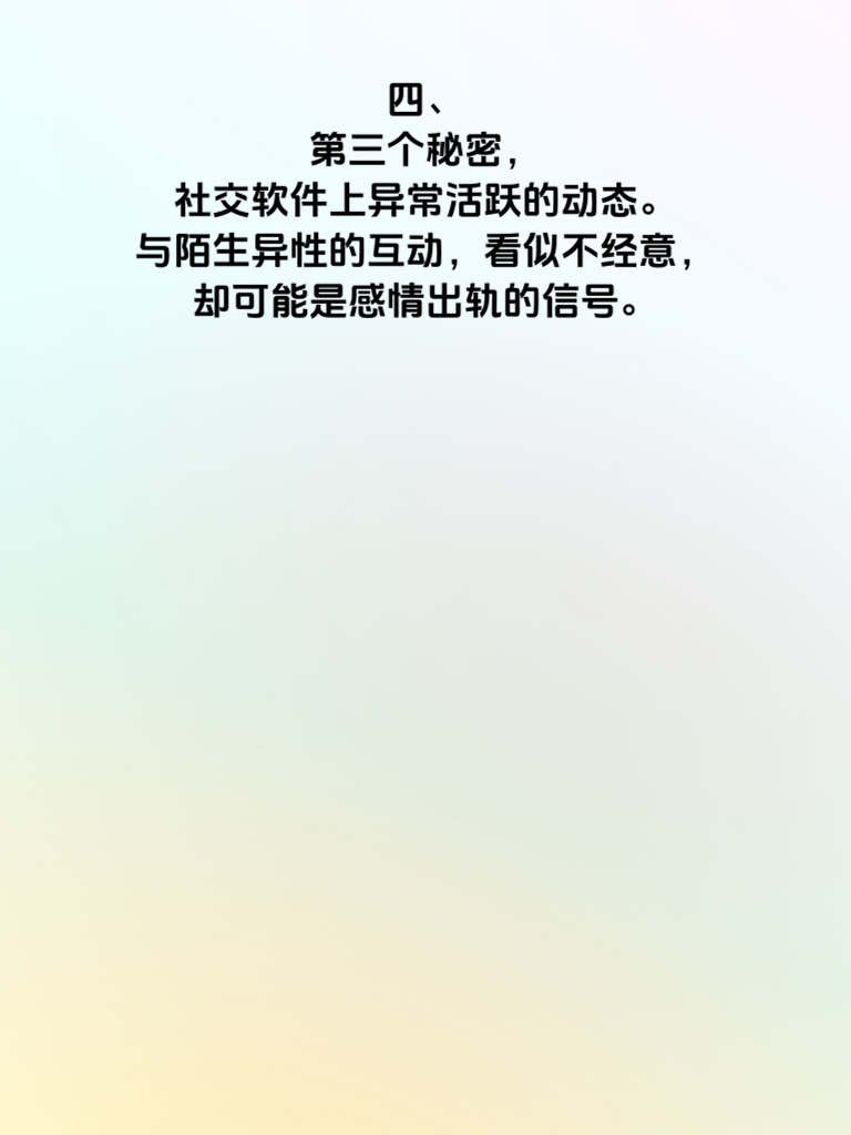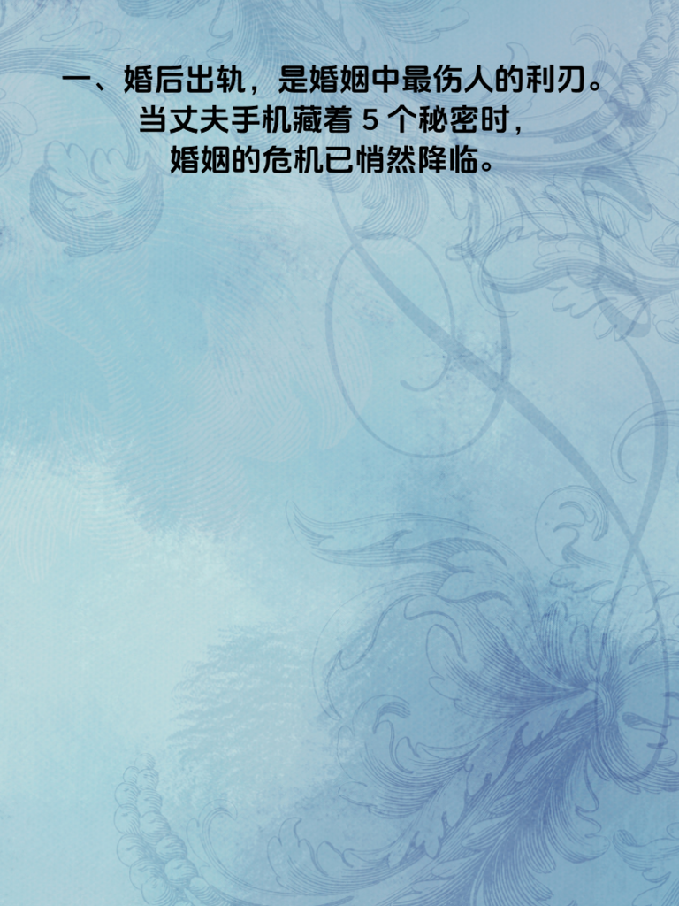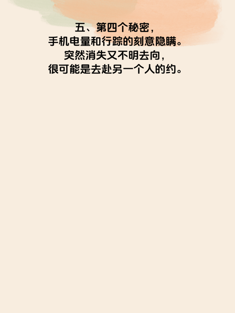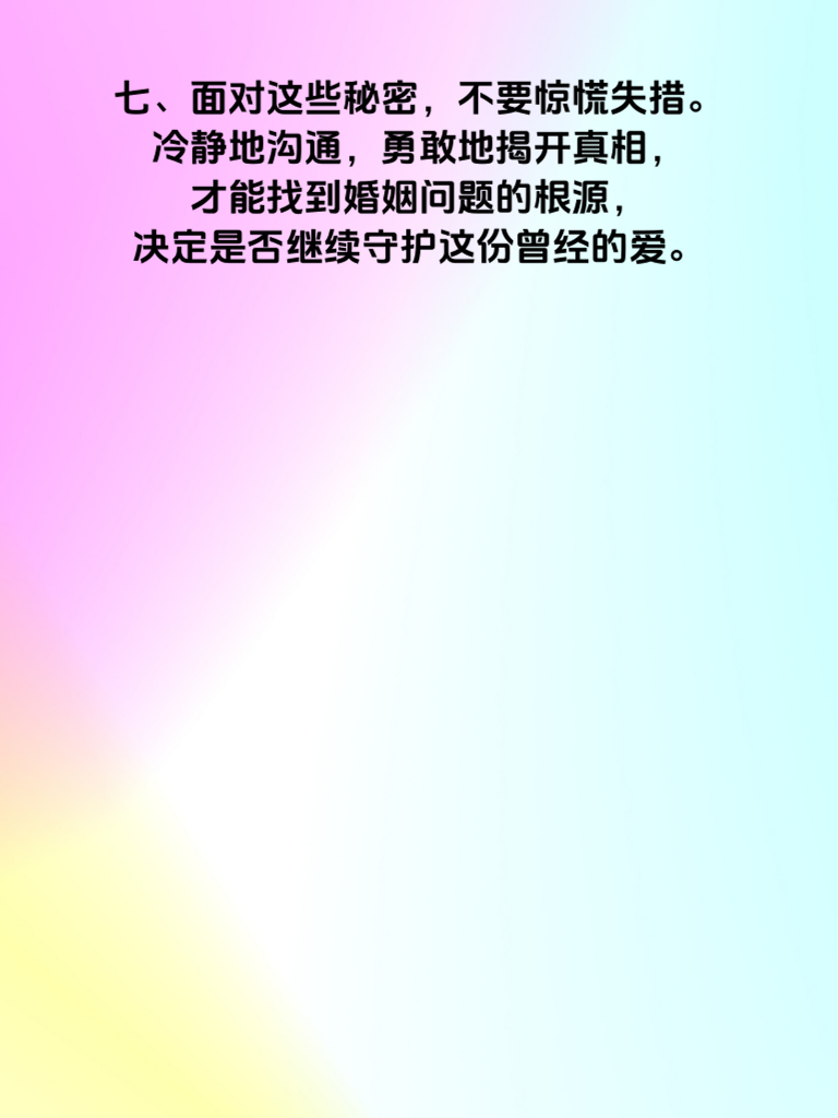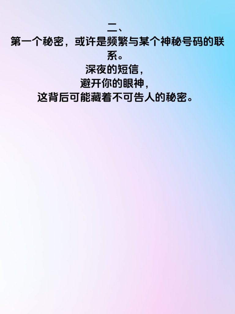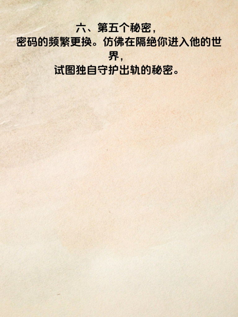 一、婚后出轨,是婚姻中最伤人的利刃。当丈夫手机藏着5个秘密时,婚姻的危机已悄然降临。 二、第一个秘密,或许是频繁与某个神秘号码的联系。深夜的短信,避开你的眼神,这背后可能藏着不可告人的秘密。 三、第二个秘密,是手机里加密的相册或文件。那里也许有他不想让你看到的照片或信息,是背叛的蛛丝马迹。 四、第三个秘密,社交软件上异常活跃的动态。与陌生异性的互动,看似不经意,却可能是感情出轨的信号。 五、第四个秘密,手机电量和行踪的刻意隐瞒。突然消失又不明去向,很可能是去赴另一个人的约。 六、第五个秘密,密码的频繁更换。仿佛在隔绝你进入他的世界,试图独自守护出轨的秘密。 七、面对这些秘密,不要惊慌失措。冷静地沟通,勇敢地揭开真相,才能找到婚姻问题的根源,决定是否继续守护这份曾经的爱。
