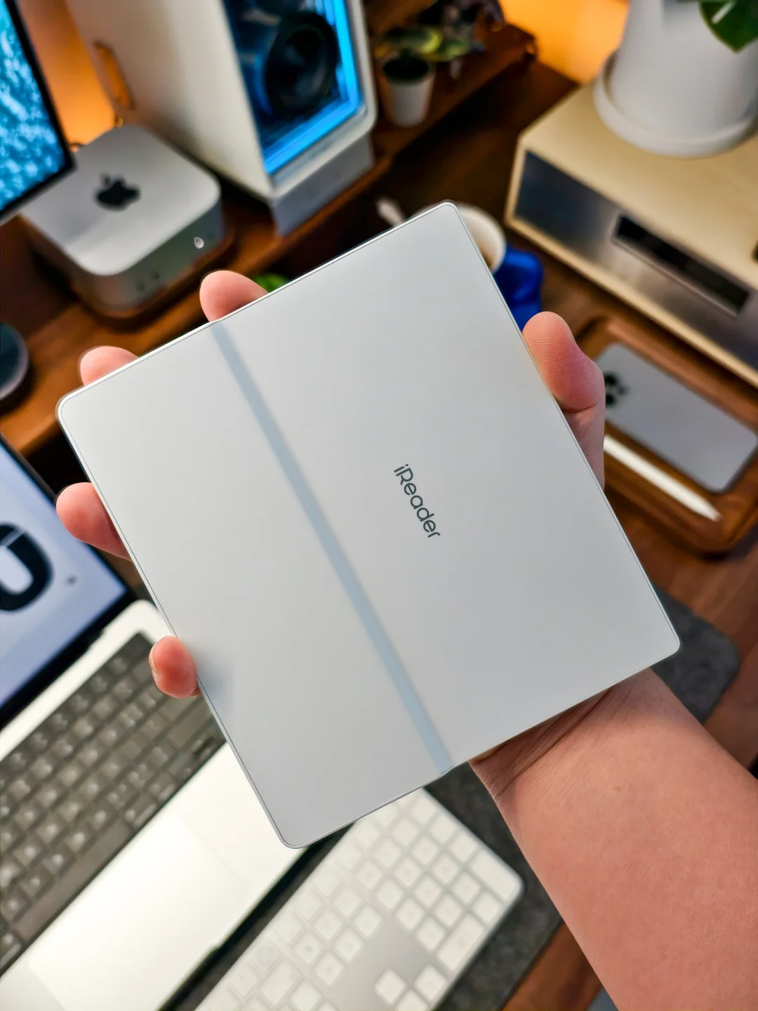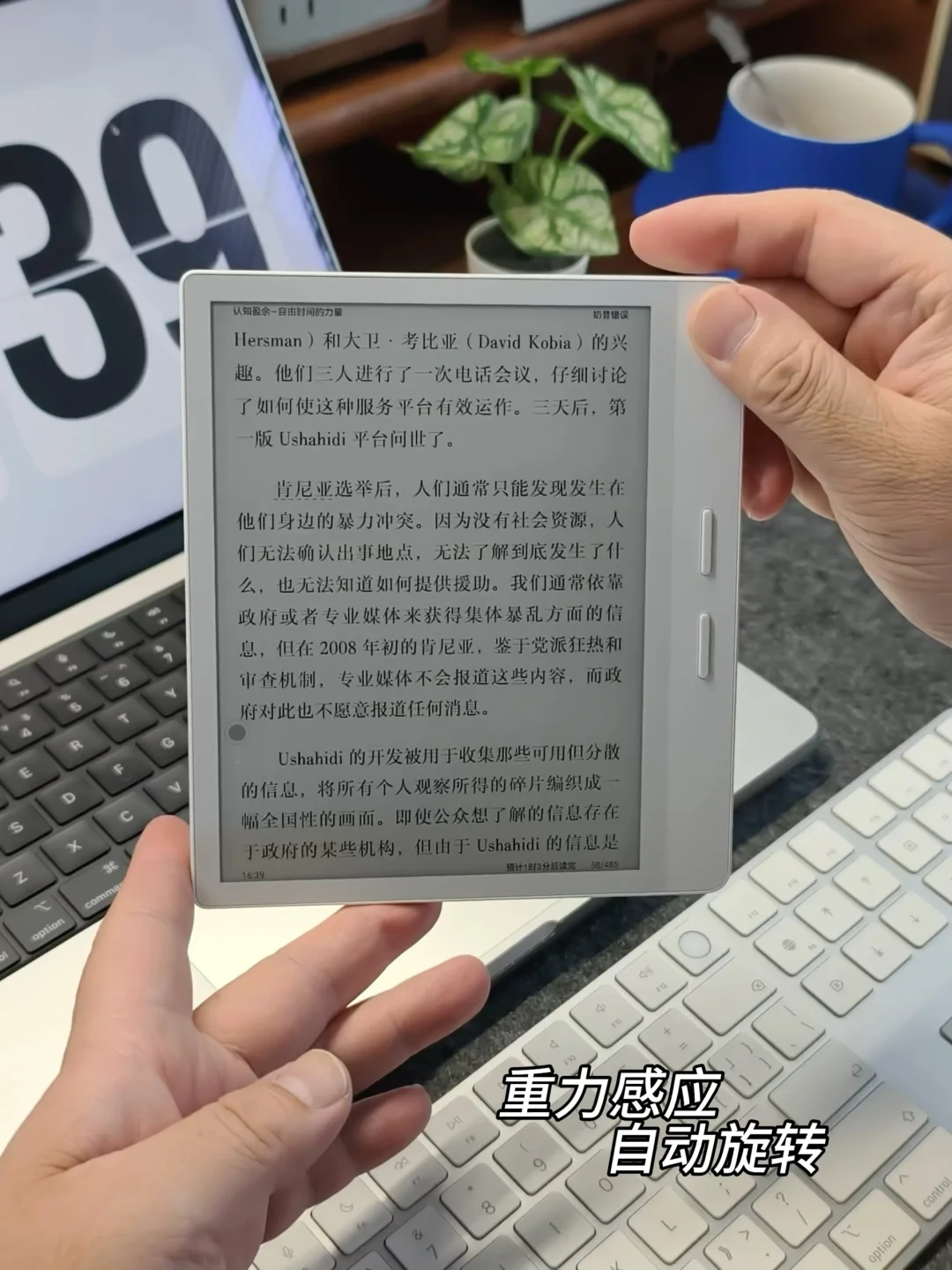 巴掌大的身形小巧便携,人体工学设计贴合手掌弧度,握持时如同捧着一本轻薄的单行本,179g的重量,4m纤薄厚度长时间阅读也不会觉得吃力。
