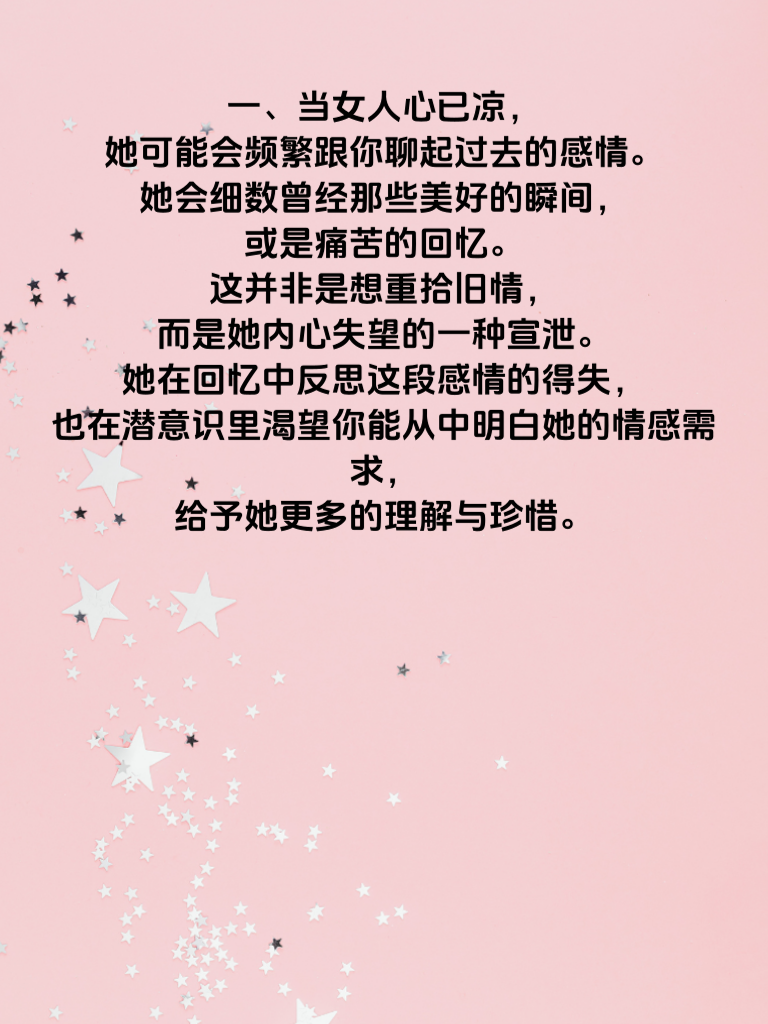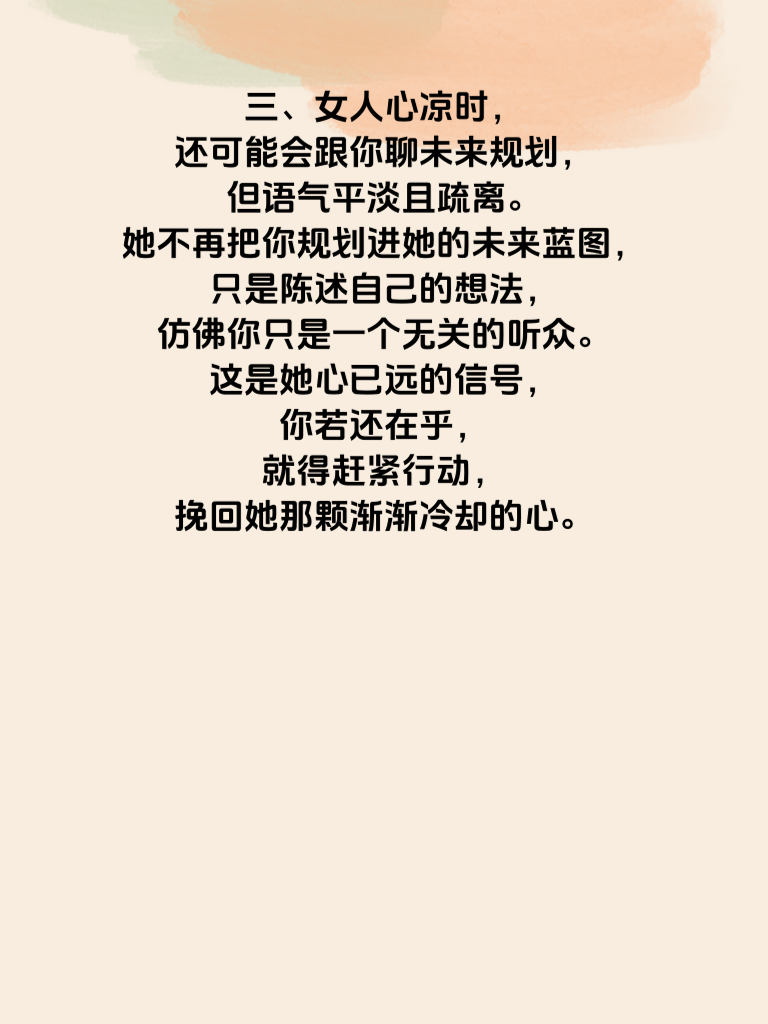 一、当女人心已凉,她可能会频繁跟你聊起过去的感情。她会细数曾经那些美好的瞬间,或是痛苦的回忆。这并非是想重拾旧情,而是她内心失望的一种宣泄。她在回忆中反思这段感情的得失,也在潜意识里渴望你能从中明白她的情感需求,给予她更多的理解与珍惜。 二、她或许会常常跟你聊起无关紧要的琐事。比如今天看到的一朵花很漂亮,路上遇到的一只可爱小狗。看似闲聊,实则是她在情感疏离后的自我保护。她不再愿意深入探讨你们之间的核心问题,用这些琐碎话题筑起一道屏障,避免再次受到伤害。 三、女人心凉时,还可能会跟你聊未来规划,但语气平淡且疏离。她不再把你规划进她的未来蓝图,只是陈述自己的想法,仿佛你只是一个无关的听众。这是她心已远的信号,你若还在乎,就得赶紧行动,挽回她那颗渐渐冷却的心。