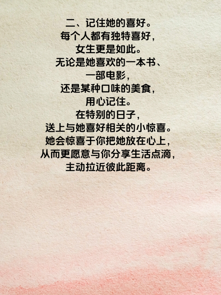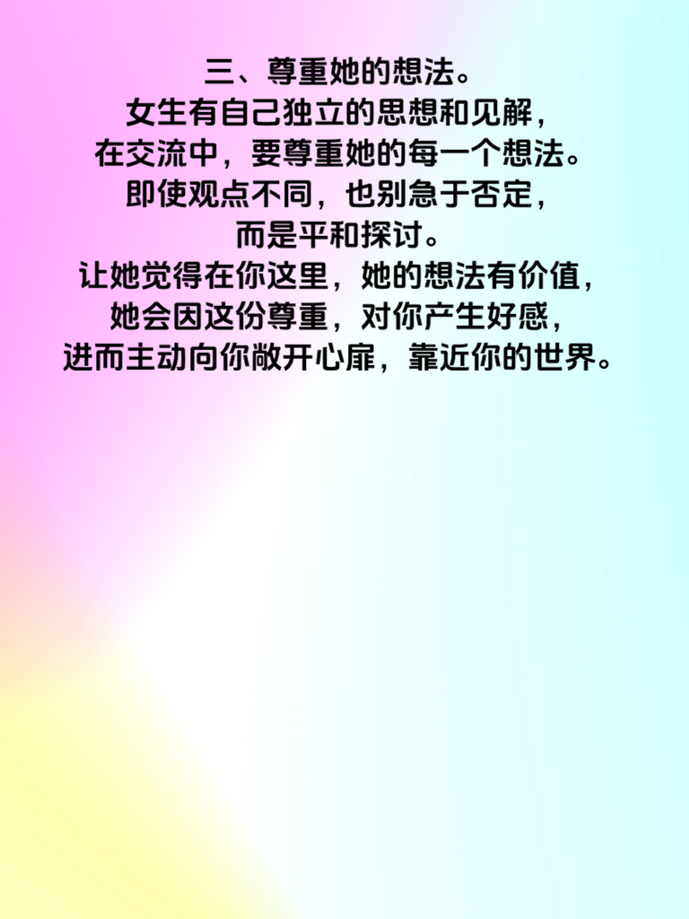 一、关注她的小情绪。女生心思细腻,情绪常常藏在细微之处。当她眉头微皱,可能是遇到烦心事;嘴角微微下垂,或许心情不佳。这时,你要敏锐察觉,轻声询问,给她倾诉的机会。用耐心倾听,让她感受到被在乎,她会因这份贴心而主动靠近你。 二、记住她的喜好。每个人都有独特喜好,女生更是如此。无论是她喜欢的一本书、一部电影,还是某种口味的美食,用心记住。在特别的日子,送上与她喜好相关的小惊喜。她会惊喜于你把她放在心上,从而更愿意与你分享生活点滴,主动拉近彼此距离。 三、尊重她的想法。女生有自己独立的思想和见解,在交流中,要尊重她的每一个想法。即使观点不同,也别急于否定,而是平和探讨。让她觉得在你这里,她的想法有价值,她会因这份尊重,对你产生好感,进而主动向你敞开心扉,靠近你的世界。