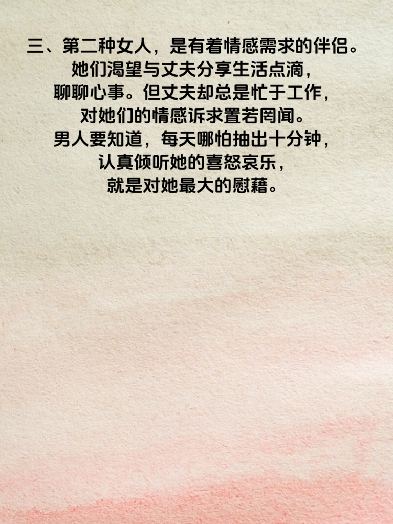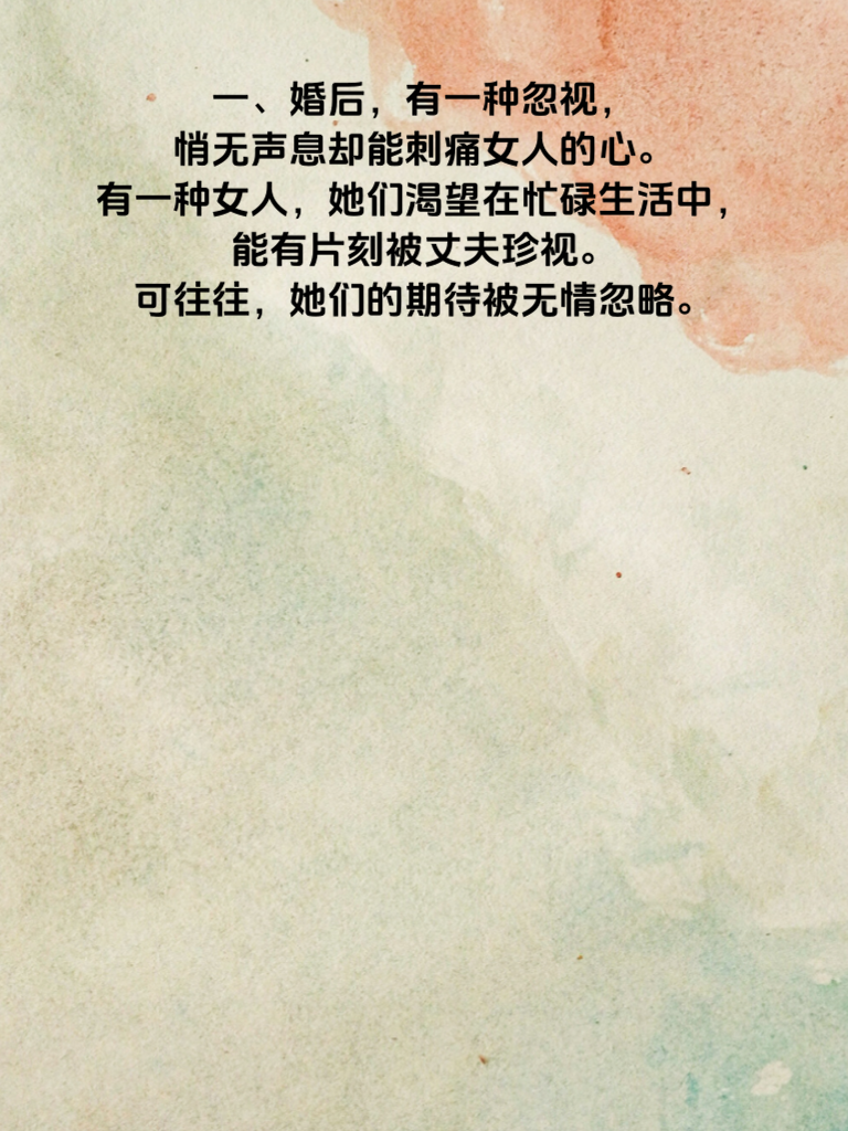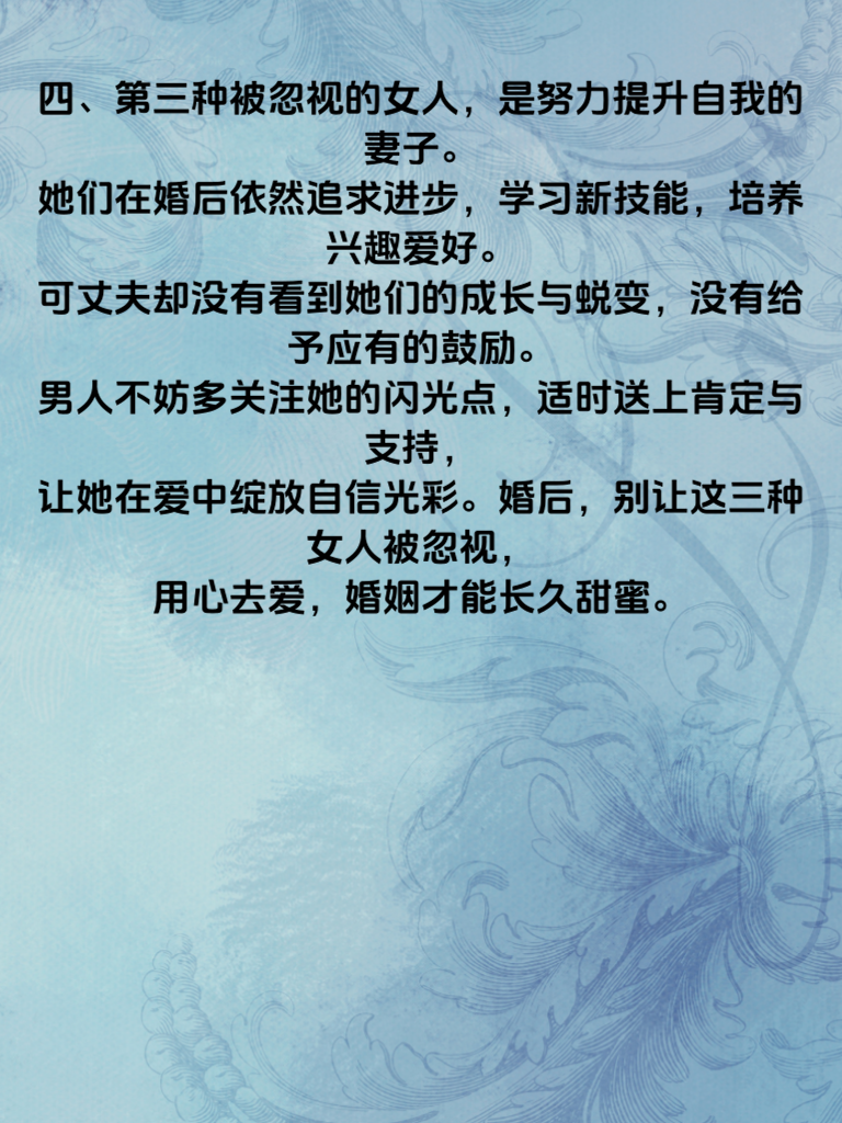 一、婚后,有一种忽视,悄无声息却能刺痛女人的心。有一种女人,她们渴望在忙碌生活中,能有片刻被丈夫珍视。可往往,她们的期待被无情忽略。 二、第一种被忽视的女人,是为家庭默默付出的贤妻。从清晨准备早餐,到夜晚操持家务,她们的付出如流水,滋养着家庭。然而,丈夫却常常视而不见,忘记她们的疲惫与辛劳。其实,男人只需偶尔的一句赞美,一个帮忙分担家务的举动,就能让她们倍感温暖。 三、第二种女人,是有着情感需求的伴侣。她们渴望与丈夫分享生活点滴,聊聊心事。但丈夫却总是忙于工作,对她们的情感诉求置若罔闻。男人要知道,每天哪怕抽出十分钟,认真倾听她的喜怒哀乐,就是对她最大的慰藉。 四、第三种被忽视的女人,是努力提升自我的妻子。她们在婚后依然追求进步,学习新技能,培养兴趣爱好。可丈夫却没有看到她们的成长与蜕变,没有给予应有的鼓励。男人不妨多关注她的闪光点,适时送上肯定与支持,让她在爱中绽放自信光彩。婚后,别让这三种女人被忽视,用心去爱,婚姻才能长久甜蜜。