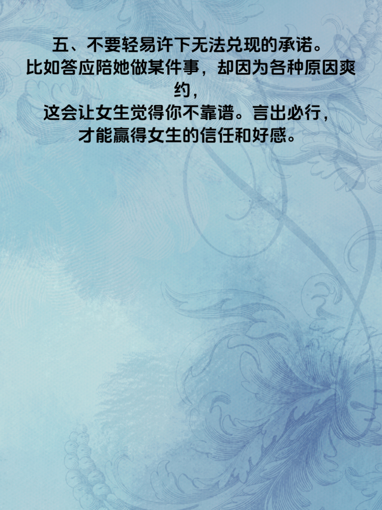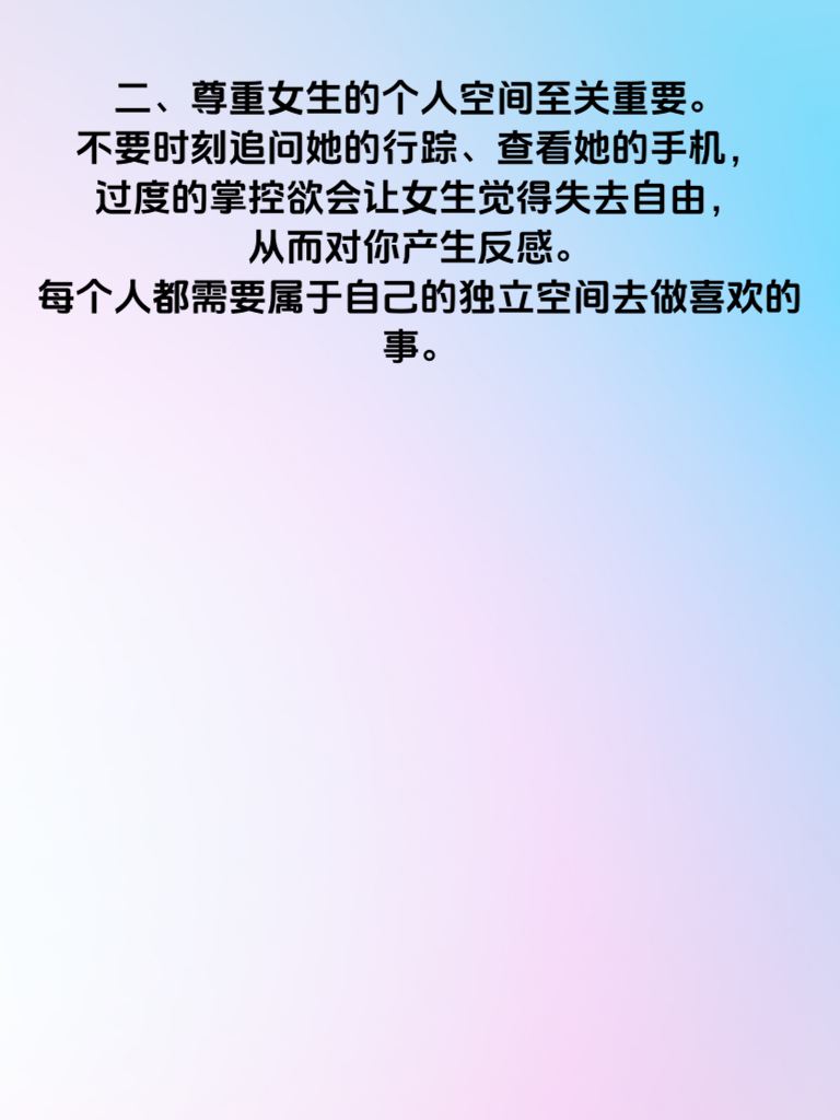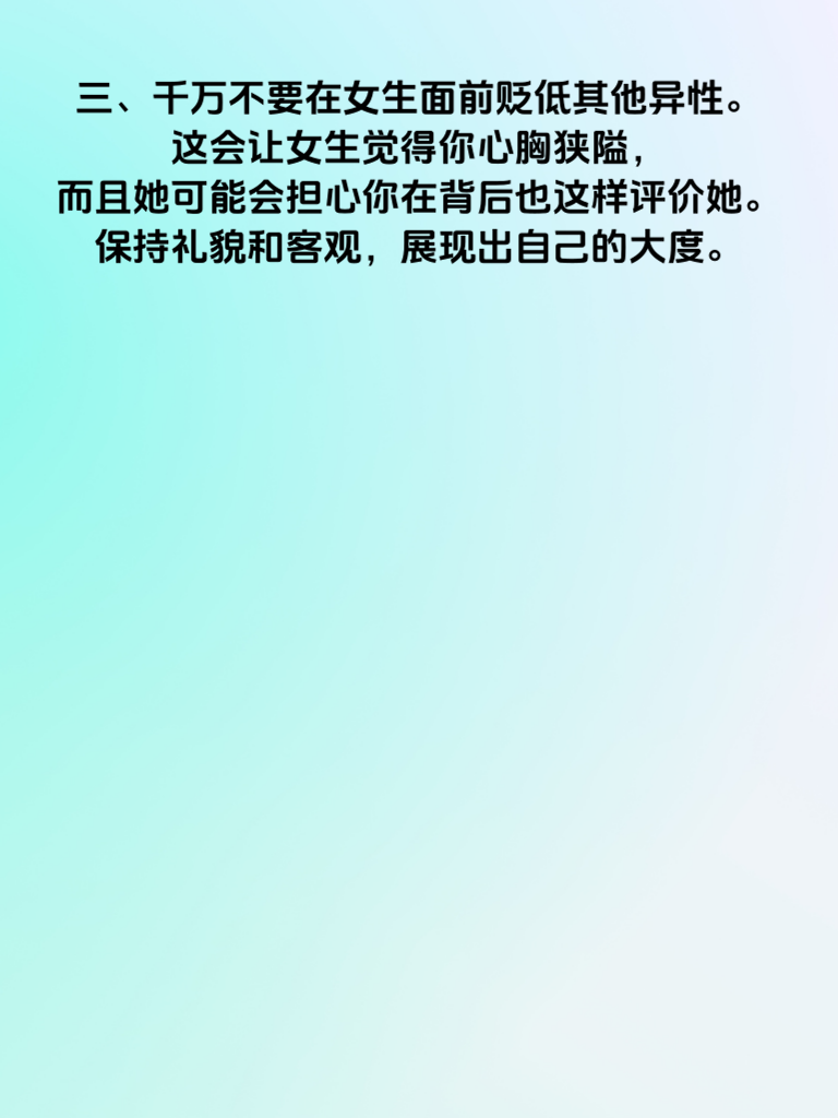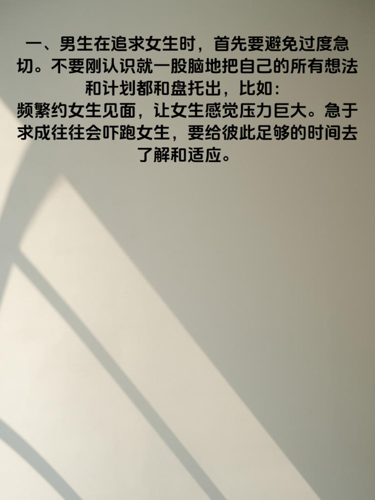 一、男生在追求女生时,首先要避免过度急切。不要刚认识就一股脑地把自己的所有想法和计划都和盘托出,比如频繁约女生见面,让女生感觉压力巨大。急于求成往往会吓跑女生,要给彼此足够的时间去了解和适应。 二、尊重女生的个人空间至关重要。不要时刻追问她的行踪、查看她的手机,过度的掌控欲会让女生觉得失去自由,从而对你产生反感。每个人都需要属于自己的独立空间去做喜欢的事。 三、千万不要在女生面前贬低其他异性。这会让女生觉得你心胸狭隘,而且她可能会担心你在背后也这样评价她。保持礼貌和客观,展现出自己的大度。 四、避免只谈自己感兴趣的话题。如果每次聊天都围绕着你喜欢的游戏、体育等,而不顾及女生的喜好,她会觉得你不重视她。要学会倾听女生的想法,找到共同话题。 五、不要轻易许下无法兑现的承诺。比如答应陪她做某件事却因为各种原因爽约,这会让女生觉得你不靠谱。言出必行,才能赢得女生的信任和好感。