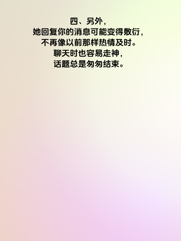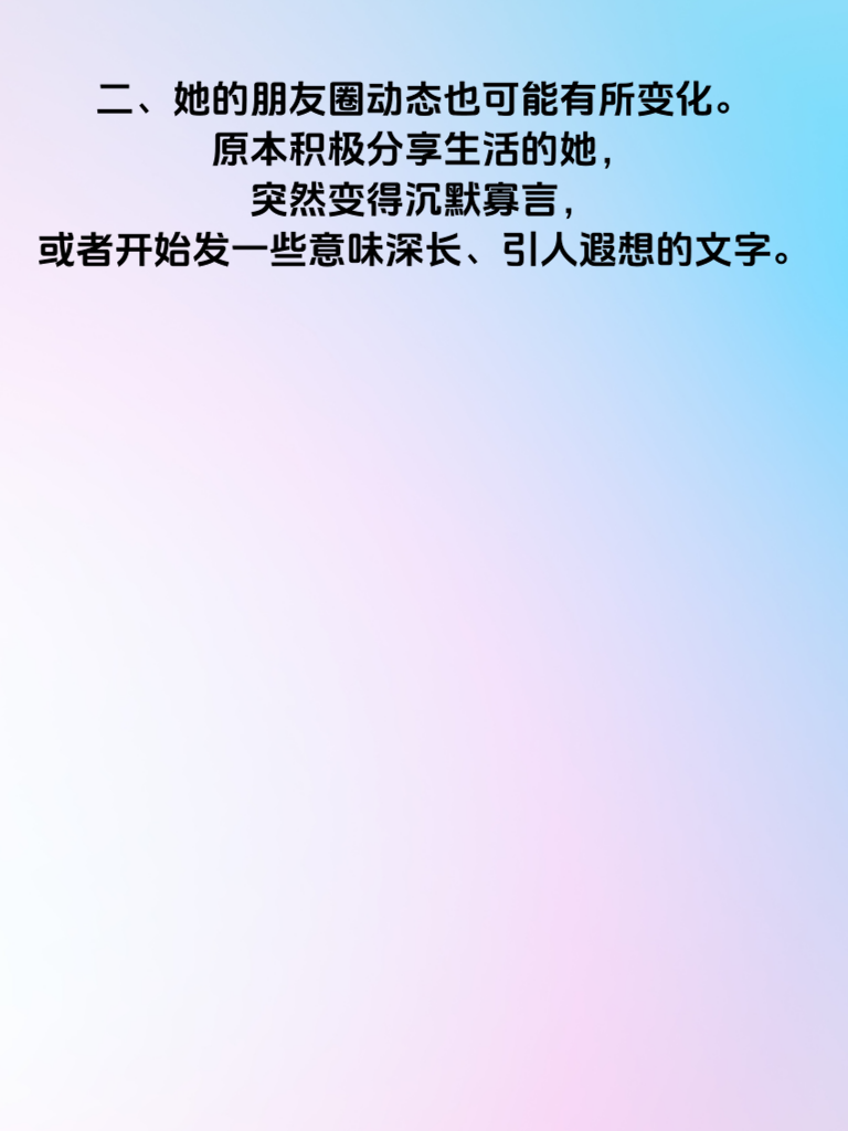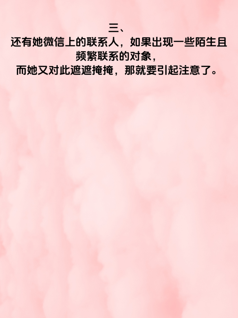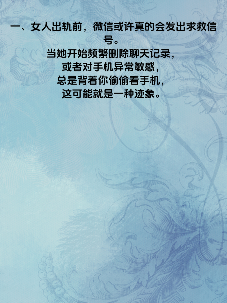 一、女人出轨前,微信或许真的会发出求救信号。当她开始频繁删除聊天记录,或者对手机异常敏感,总是背着你偷偷看手机,这可能就是一种迹象。 二、她的朋友圈动态也可能有所变化。原本积极分享生活的她,突然变得沉默寡言,或者开始发一些意味深长、引人遐想的文字。 三、还有她微信上的联系人,如果出现一些陌生且频繁联系的对象,而她又对此遮遮掩掩,那就要引起注意了。 四、另外,她回复你的消息可能变得敷衍,不再像以前那样热情及时。聊天时也容易走神,话题总是匆匆结束。 五、男人要多留意这些微信中的细节。当发现这些求救信号时,不要急于指责,而是冷静沟通,了解她内心的想法,或许能避免感情走向破裂。