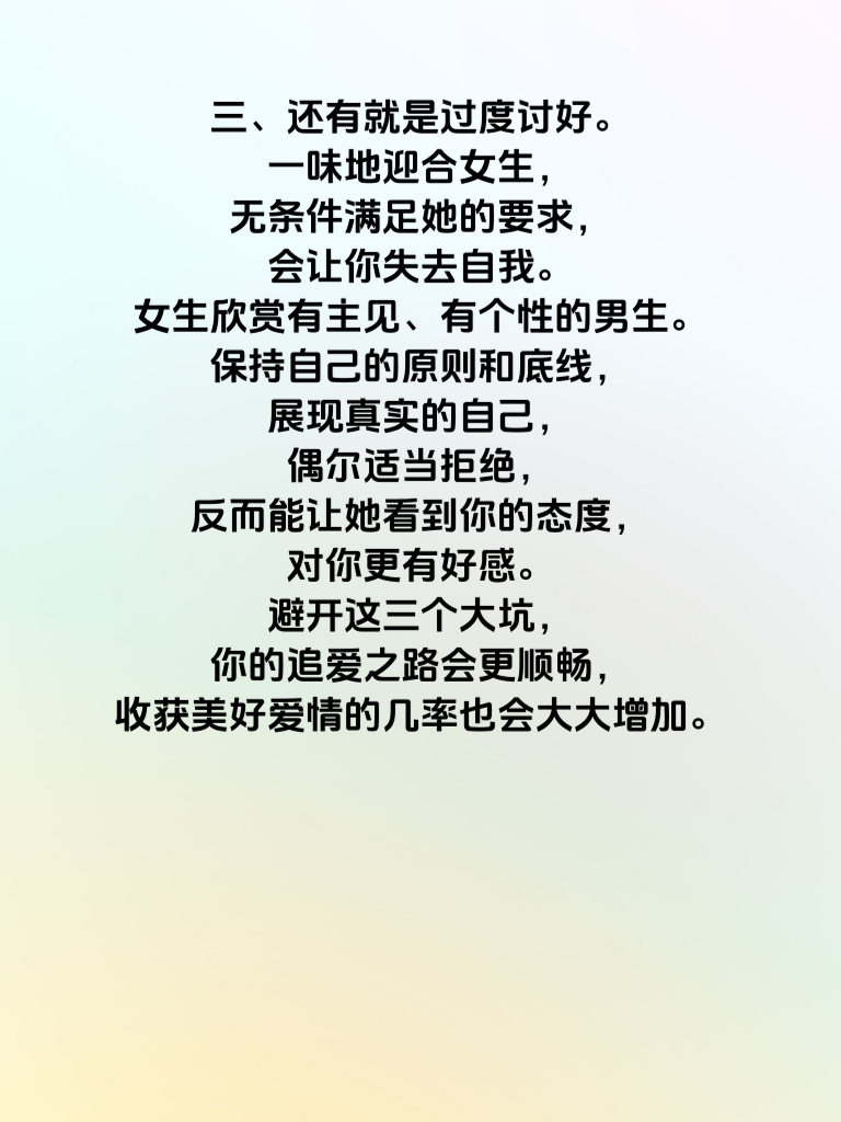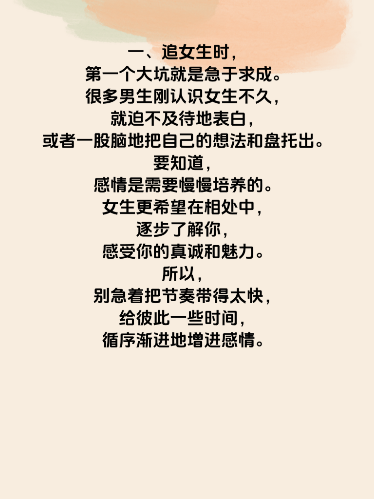 一、追女生时,第一个大坑就是急于求成。很多男生刚认识女生不久,就迫不及待地表白,或者一股脑地把自己的想法和盘托出。要知道,感情是需要慢慢培养的。女生更希望在相处中,逐步了解你,感受你的真诚和魅力。所以,别急着把节奏带得太快,给彼此一些时间,循序渐进地增进感情。 二、不懂倾听也是个大问题。在与女生交流时,有些男生只顾自己说,不关注女生的想法和感受。女生其实很渴望被理解和尊重,当你认真倾听她说话,给予回应时,她会觉得自己被重视。试着多问问她的看法,耐心听她分享生活点滴,这样能让你们的关系更亲近。 三、还有就是过度讨好。一味地迎合女生,无条件满足她的要求,会让你失去自我。女生欣赏有主见、有个性的男生。保持自己的原则和底线,展现真实的自己,偶尔适当拒绝,反而能让她看到你的态度,对你更有好感。避开这三个大坑,你的追爱之路会更顺畅,收获美好爱情的几率也会大大增加。