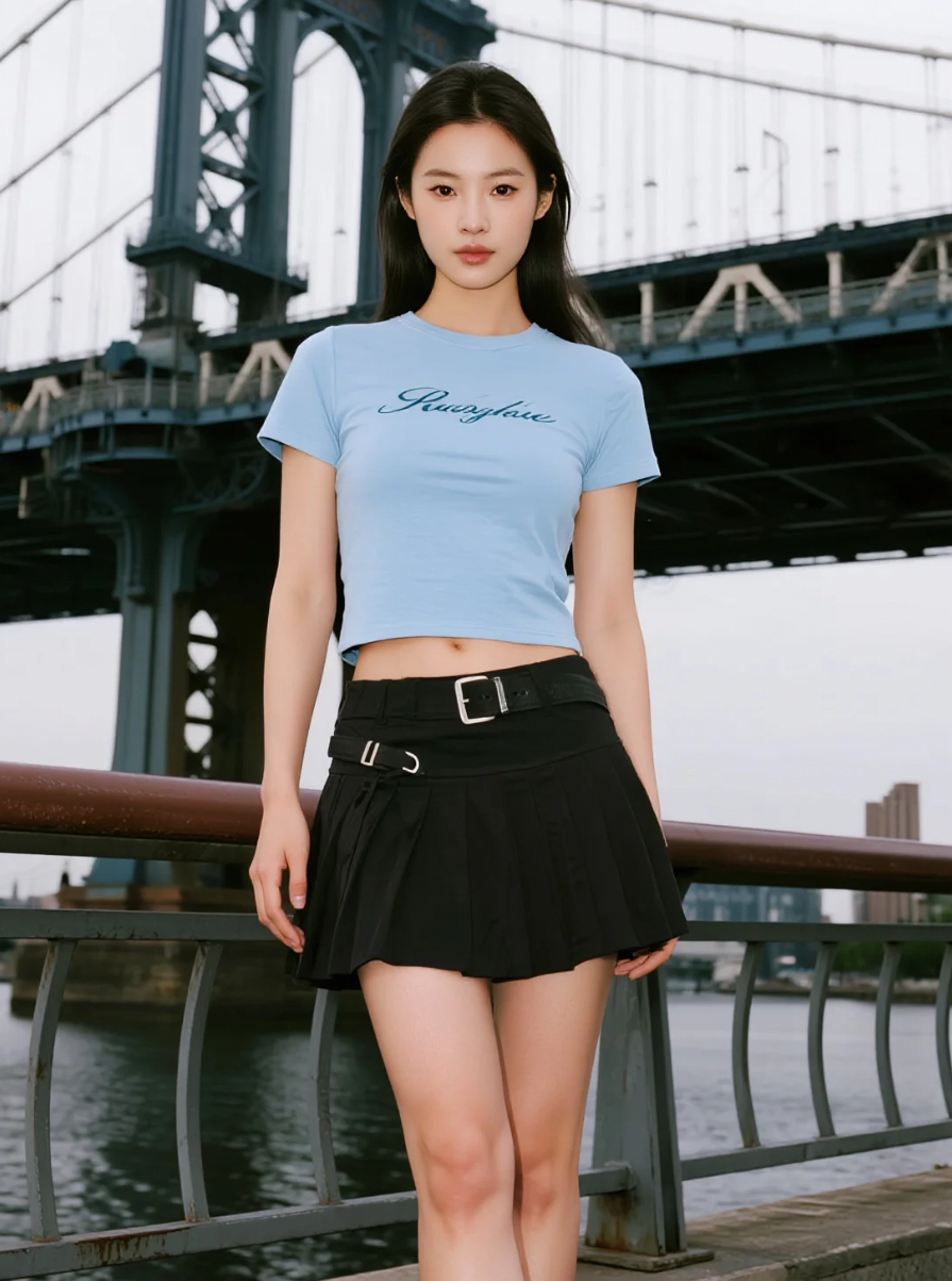 阳光沙滩上,长发女孩的T恤被晚风轻拂