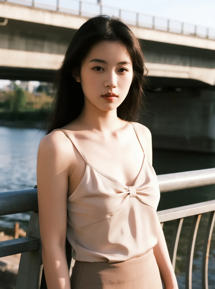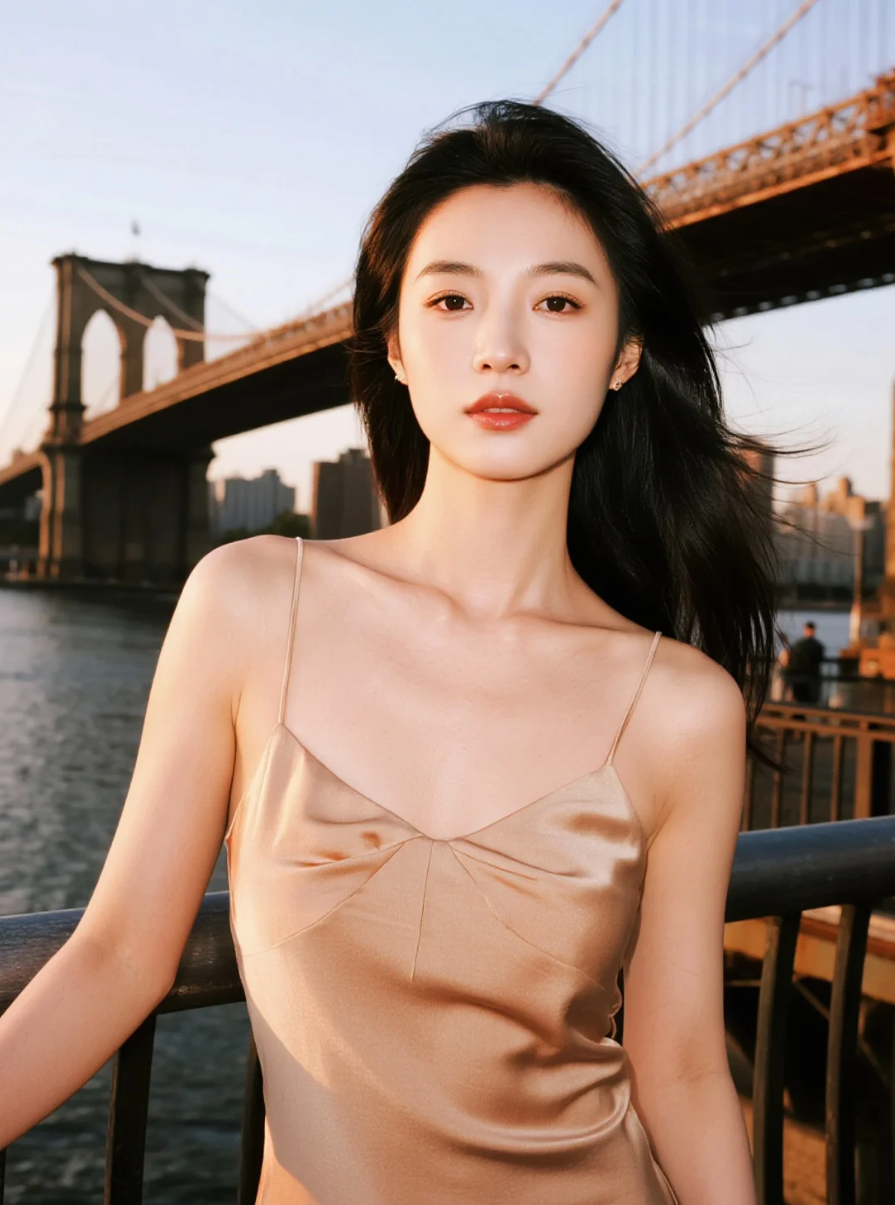 沙滩长发女孩,晚风轻抚,笑容温柔而充满神秘