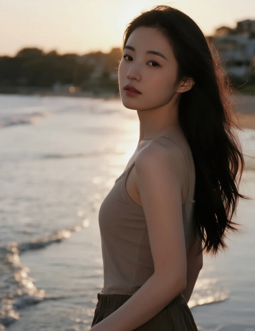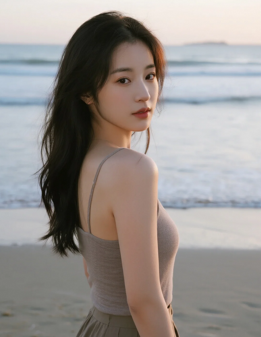 沙滩长发女孩,晚风轻抚,笑容温柔而充满神秘