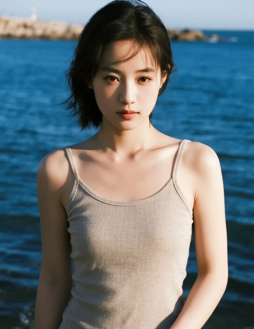 沙滩长发女孩,晚风轻抚,笑容温柔而充满神秘