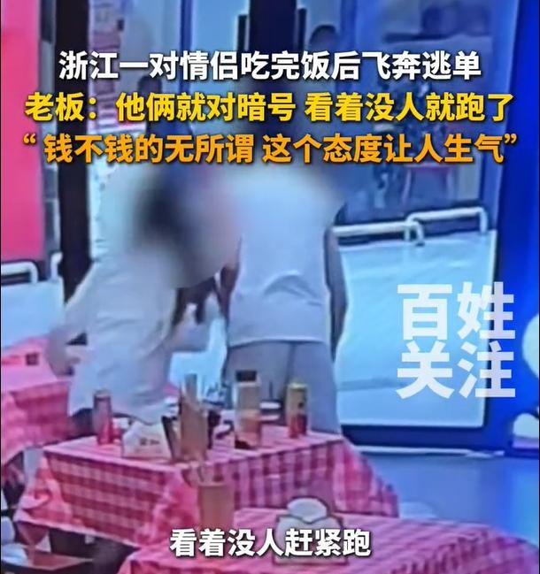 “1、2、3跑!”浙江一对情侣,在饭店吃完“霸王餐”、对好暗号、说跑就跑。餐厅老板称,年纪轻轻,素质极差,既然你们想火,那就让你们火,监控视频调出来,让大家评评理。 据百姓关注8月20日报道称,浙江一对小情侣,在一家餐厅吃晚饭,对好暗号,相约一起飞奔逃单。老板说,实在是太令人生气了。 8月20日晚间8点左右,一对情侣来到一家餐厅吃饭。俩人进到餐厅,专门找了靠近大门口的一处位子,坐下来点餐。 点完餐,服务员陆陆续续给俩人上了菜、饮料,看到一桌子菜,俩情侣非常满意的开始用餐。期间,小情侣不断交头接耳、窃窃私语,似乎在计划着什么“天大的阴谋”。 餐厅里就餐,大家也都知道的,老板不会一直盯着顾客吃饭,文明就餐,大家都很自觉。所以在情侣吃饭期间,服务员、老板都在忙着各自的事情。 快要吃完的时候,这对情侣坐的更加靠近了,眼睛眨巴眨巴的,似乎还在密谋刚刚没有执行的计划。只见男孩子在一边交代、一边手指着大门口;而旁边的女孩则点点头,对男孩的计划表示赞同。 说时迟、那时快,只见男孩子嘴巴里发出“三、二、一”的指令,一边的女孩子赶紧配合。二人共同站起来了,手拉手的飞快朝大门口跑去。 当时服务员还在懵逼中呢,以为俩人是不是要到门外去取外卖,还是要到外面去买什么东西呢。但是,等了很久,也没有看到俩人回头。 而这边的桌子上呢,则残留着俩人“大快朵颐”的残羹剩汁。好家伙,饭倒是吃的精光,这个饭钱,却一分钱也不想给了。 看到一溜烟而去的俩情侣,服务员赶紧上报给了自己的老板。老板说,肯定是忘记了,不要随便冤枉人家。 服务员建议老板还是查看一下监控吧,看一下具体的情况,这样也可以了解当时的情况。老板说,那就打开监控瞧瞧。 本着信任的态度,老板还在为俩情侣说好话呢,一看监控,老板真的脸都要气绿了。这哪里是什么忘记买单了呀,这就是蓄谋已久。 老板说,看着前因后果,就可以清楚看到,俩家伙就在盘算逃单这件事,而且两人还在积极的对着暗号,看准时机,男孩子拉着女孩子就跑。这就是故意想要吃一顿“霸王餐”! 现在人都跑没影了,还能怎么办呢,老板说,其实也就一百多块钱,这点钱无所谓,但是这对情侣的这个态度、这个行为,就真的很恶劣,实在是令人生气。 当晚老板就把这份监控视频给发布到网站上去,想要让网友们评评理。老板认为,他们既然想要火,那现在就让他们火一把。什么年代了,还如此没有诚信,年纪轻轻的,就做了这样没有素质的事情。真的是太让人生气了! 这件事被爆之后,网友说,有些人,天生就是爱占小便宜的,正所谓一个被窝睡不出两个人,这下真的是展现的淋漓尽致。 也有网友建议老板,还是尽快报警吧,务必要给这对情侣一个教训,不然下一个倒霉蛋还不知道会是谁呢。大家都纵然,只会让这两人越来越嚣张。 去餐厅吃饭,逃单的话,会面临怎样的处罚呢? 到餐厅就餐,想着吃霸王餐、逃单,这样的行为肯定是违法的,是要被法律处罚的。 根据《民法典》第五百七十九条规定,在餐厅吃饭如果恶意逃单,此行为则构成了民事违约,商家有权依法维权,要求对方支付餐费并且赔偿追回损失。如果逃单者拒绝履行,商家可以通过民事诉讼主张权益。 商家可以报警,及时将这两位情侣给抓捕,然后依法维权,要求对方先支付餐费,如果对方拒绝,商家可以将这对情侣告上法庭,要求民事赔偿。 在情侣逃单的时候,商家就可以立刻报警处理,警方会根据面部特征,及时将这二人抓捕归案,针对二人逃单的行为处以行政拘留,并且要求其罚款。 之前有人试图“零元购”,这儿又有人想要吃“霸王餐”,这世间所有免单的行为,都需要付出代价,否则犯罪成本也太低了。何不做一个遵纪守法的良好公民呢,否则真的是脸丢大了!对于此,您是否还有其他看法呢?