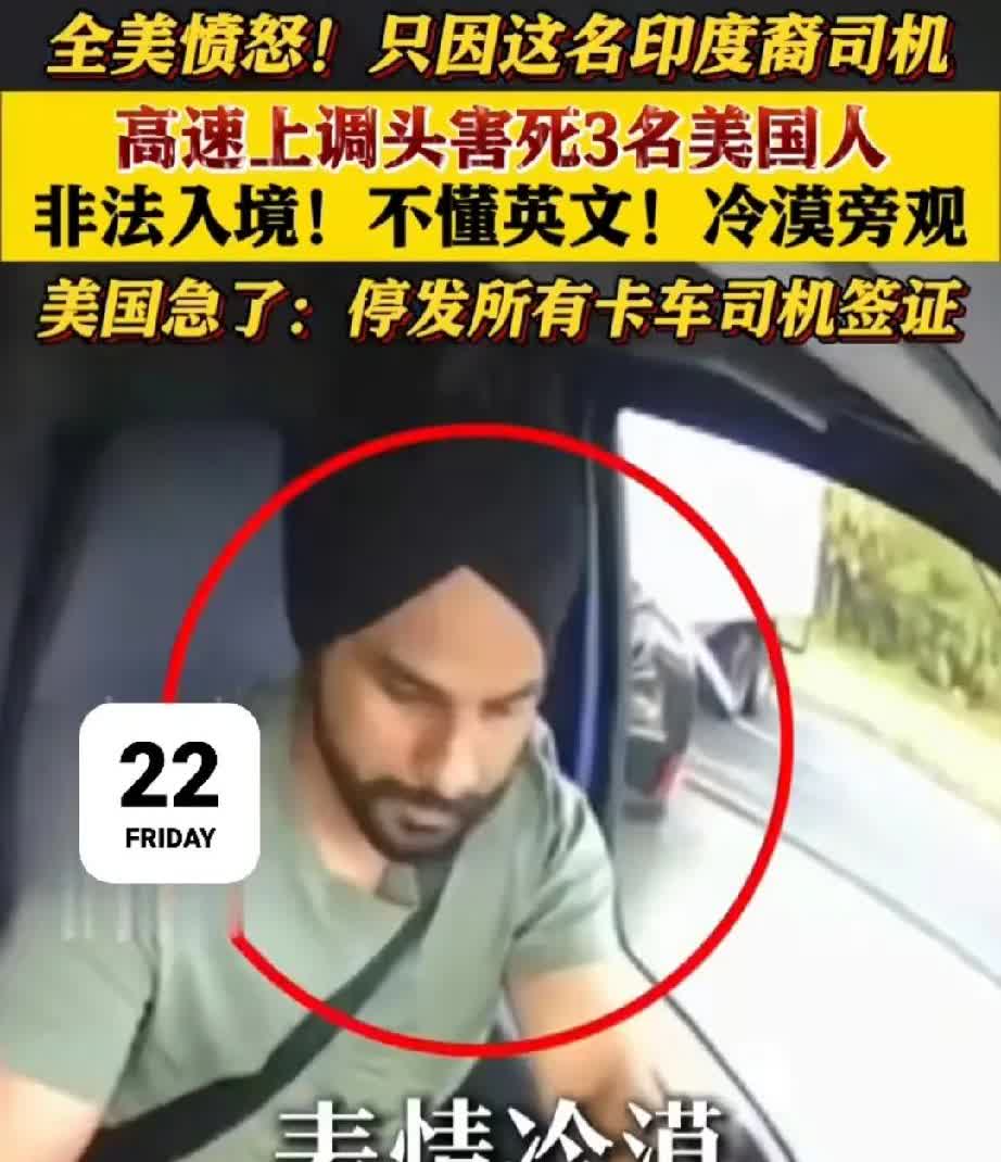 美国人这回真怒了,一个连英文标志都认不齐全的印度裔移民竟然轻松的就拿到了美国的卡车司机签证,然后竟然开着大卡车在美国高速上随意掉头,于是就发生了这起三名美国公民遇难的惨烈车祸! 更让人气愤的是这个印度裔司机在车祸发生后竟然还毫不在意,现场画面让整个美国人民都咬牙切齿! 都说美国是个移民国家,这件事也许会让美国政府不得不把不移民文化素质的要求写进移民条件里面去!