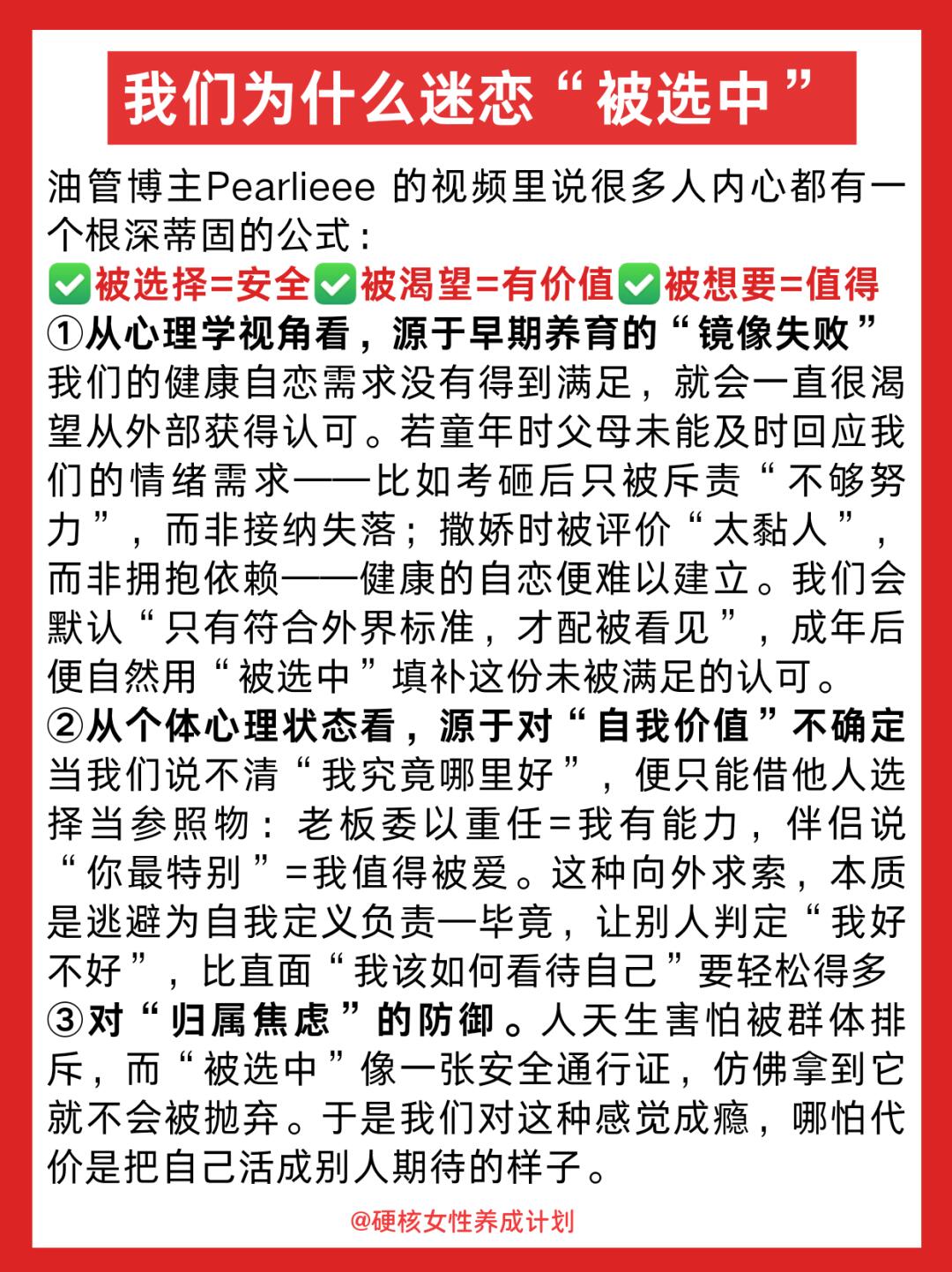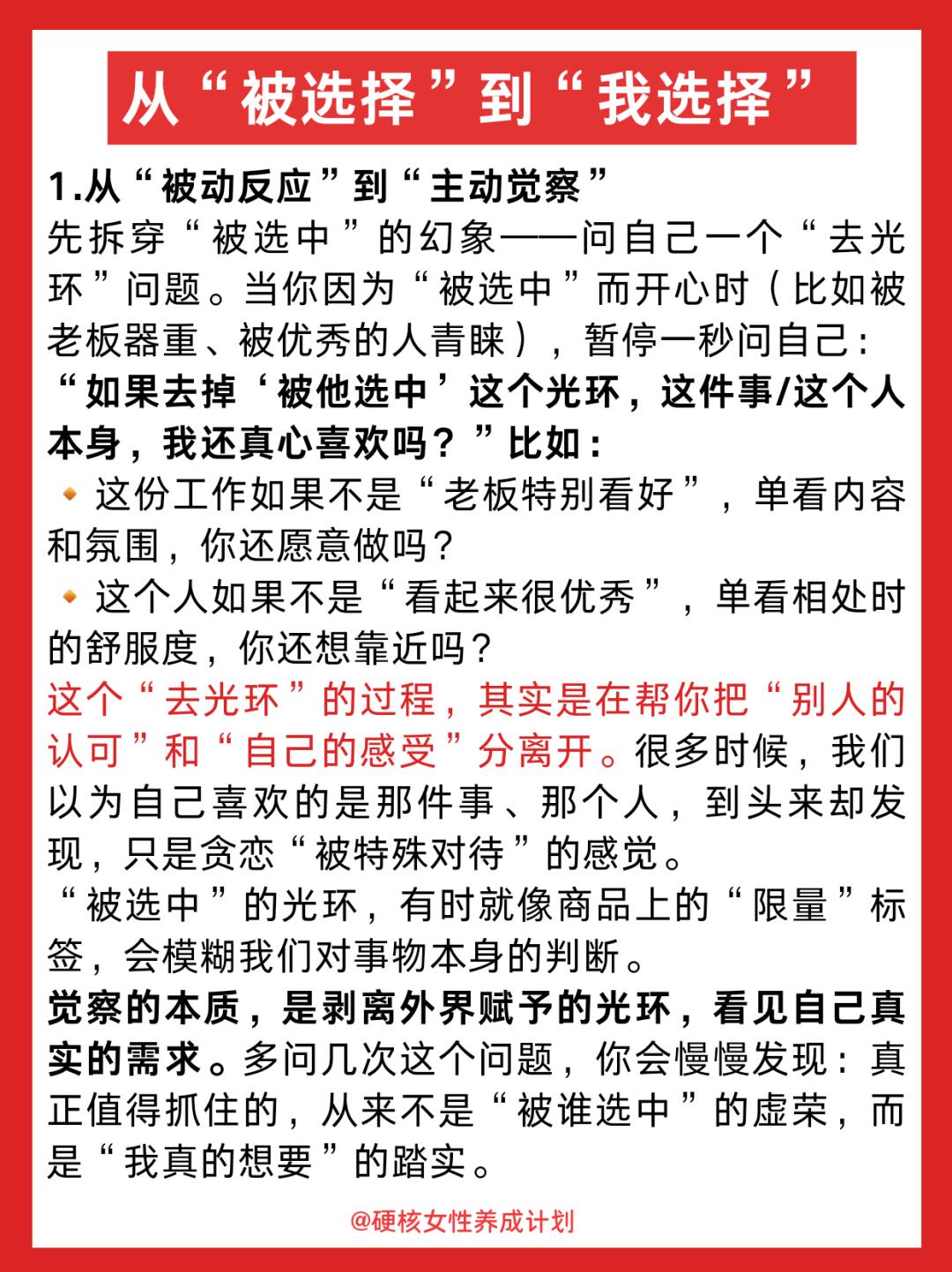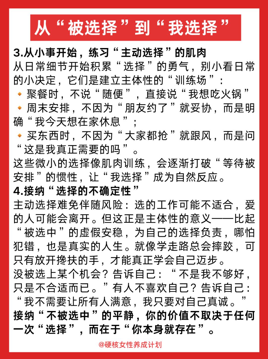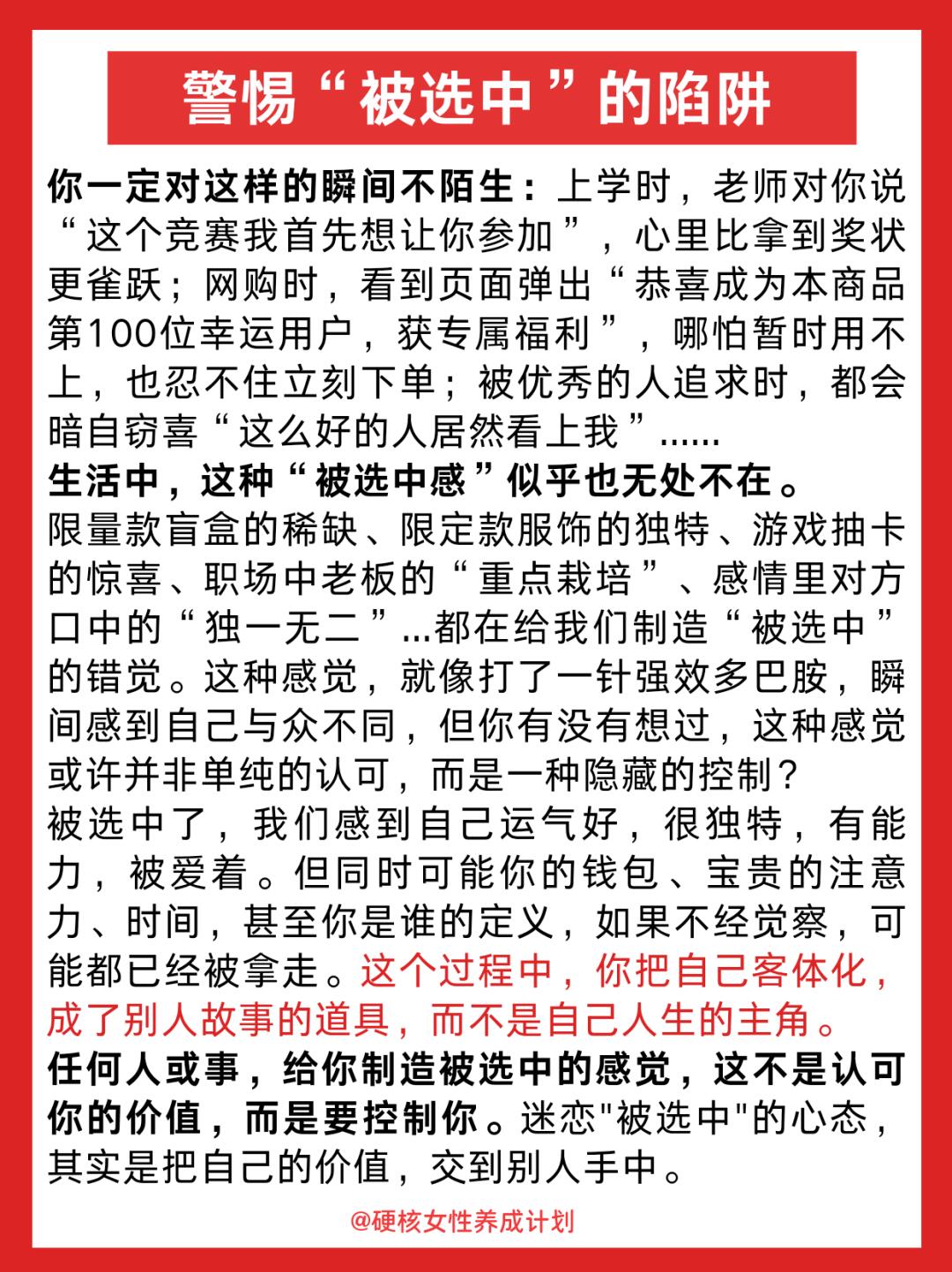 其实,真正的强大,是从“等别人选我”变成“我选我自己”。健康的主体性是,你不会总是在意是不是被什么选中了,对你重要的事是:我想选什么?你一定要明白:你的价值从不是“被谁选中”来定义的。那个会崩溃、会偷懒、会不完美的你,本身就值得被好好对待。当你学会坚定地选择自己,就再也没人能轻易控制你——