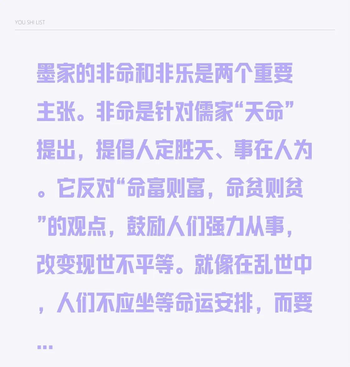 墨家的非命和非乐是两个重要主张。非命是针对儒家“天命”提出,提倡人定胜天、事在人为。它反对“命富则富,命贫则贫”的观点,鼓励人们强力从事,改变现世不平等。就像在乱世中,人们不应坐等命运安排,而要积极作为。 非乐则是反对过度沉迷于音乐。墨子认为,当时百姓饥寒交迫,王公贵族却为乐耗费人力财力,不利于国家发展和民生改善。在那个战火纷飞、民不聊生的时代,墨家的这些主张有其现实意义。