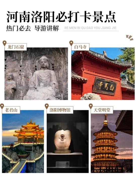 龙门石窟、白马寺、洛阳博物馆、老君山、洛邑古城、关林、隋唐城遗址……
