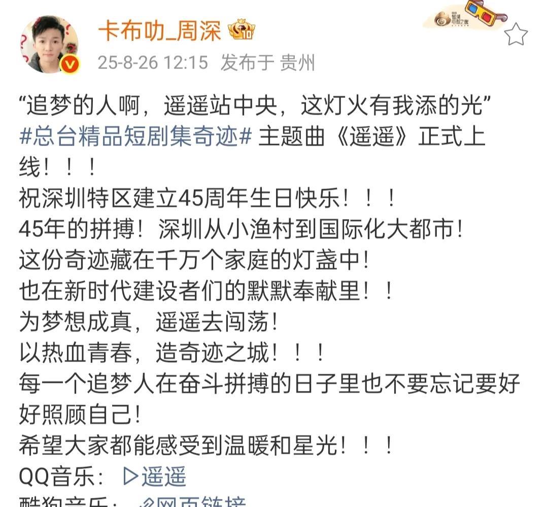 周深新歌《遥遥》上线了! 《遥遥》中央广播电视总出精品短剧集《奇迹》主题曲!庆祝深圳特区建立45周年! 很温暖,很有故事感的一首歌,好听! 周深已经回贵阳了! 米子:宝宝贵州欢迎你~ 周深:我谢谢你哈! [笑哭][笑哭][笑哭]倒反天罡了! 可可真的被米子们养的很好,天天有新衣服穿,还到处去旅游[呲牙] #周深#